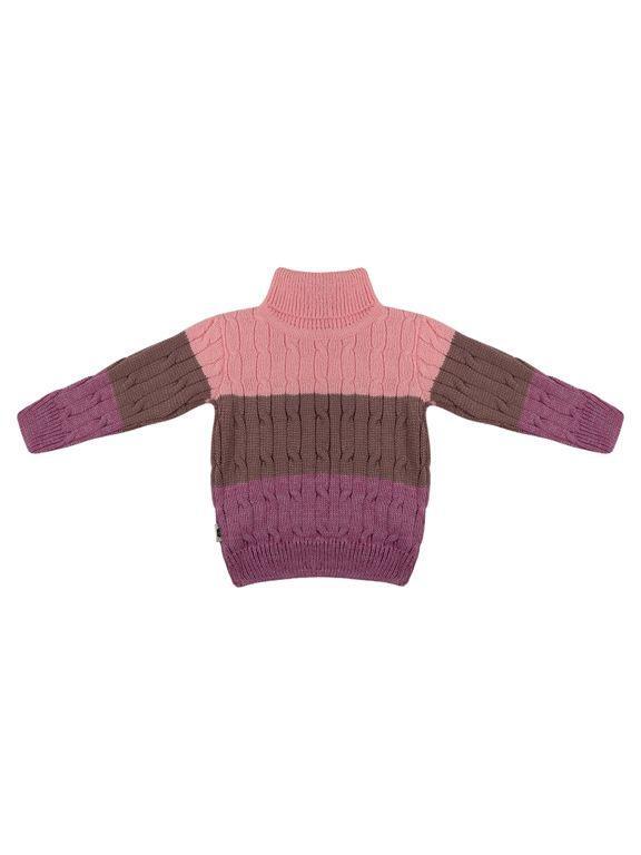 Свитер выполнен из мягкой смеси шерсти и акрила, что обеспечивает лёгкость стирки в режиме деликатной стирки при 30 °C. Цвет – нежный розовый, дополненный тонкой полосой из коричневого и фиолетового, создаёт яркий, но мягкий визуальный эффект. Высокий воротник и эластичные манжеты гарантируют надёжную защиту от сквозняков.