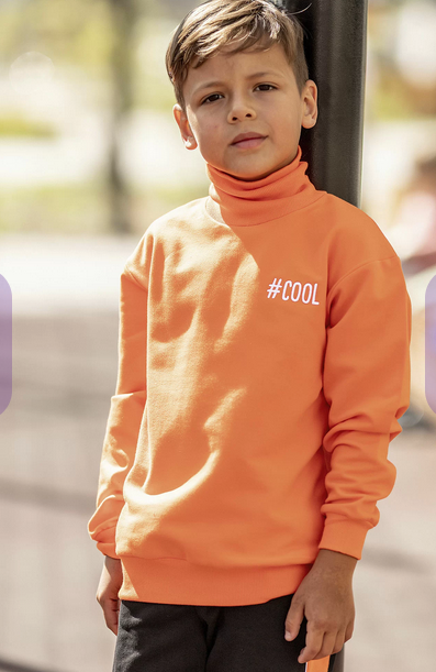 Яркий оранжевый свитшот с удобным кроем и мягкой текстурой — идеальный выбор для активных мальчиков, которые ценят комфорт и современный дизайн. Высокая горловина не только добавляет стильности образу, но и обеспечивает дополнительное тепло в прохладную погоду.
