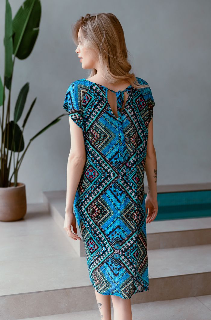 Почувствуйте лёгкость и комфорт в этой стильной пляжной тунике Anna. Модель прямого силуэта с рельефами от проймы создаёт элегантный образ, не сковывая движений. Изделие выполнено из эластичной сетки, которая мягко драпируется, подчёркивая достоинства фигуры и обеспечивая максимальную свободу. Яркий геометрический принт в голубых, чёрных, розовых и белых тонах добавляет образу индивидуальности и праздничного настроения.