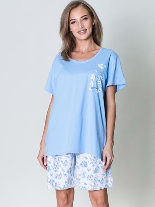 Комплект сочетает в себе простоту и элегантность. Футболка с коротким рукавом и круглым вырезом выполнена в однотонном голубом цвете и украшена небольшим цветочным принтом. Шорты белого цвета дополнены гармонирующим голубым цветочным рисунком, что создает целостный и продуманный образ. Свободный крой обоих предметов одежды не сковывает движений и подходит для разных типов фигур.