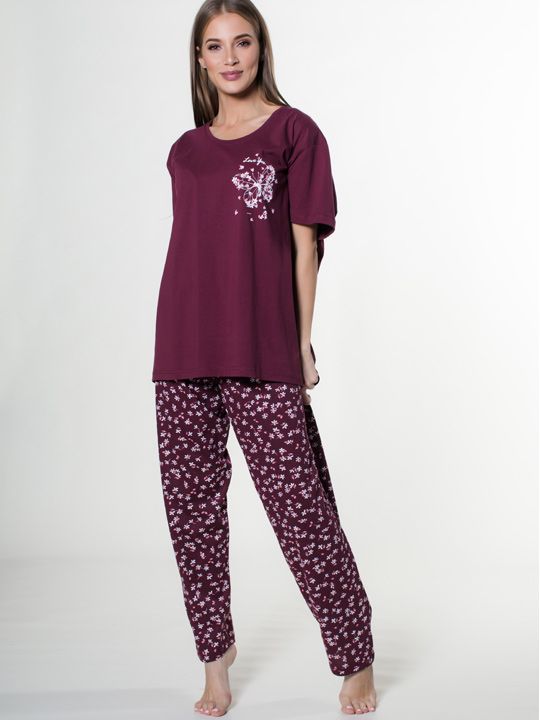 Футболка выполнена с круглым вырезом и коротким рукавом, на левой стороне груди расположен изящный принт с бабочками и цветами. Брюки имеют свободный прямой крой с резинкой на поясе для дополнительного комфорта. Принт на брюках распределен по всей поверхности, создавая гармоничный ансамбль с футболкой.