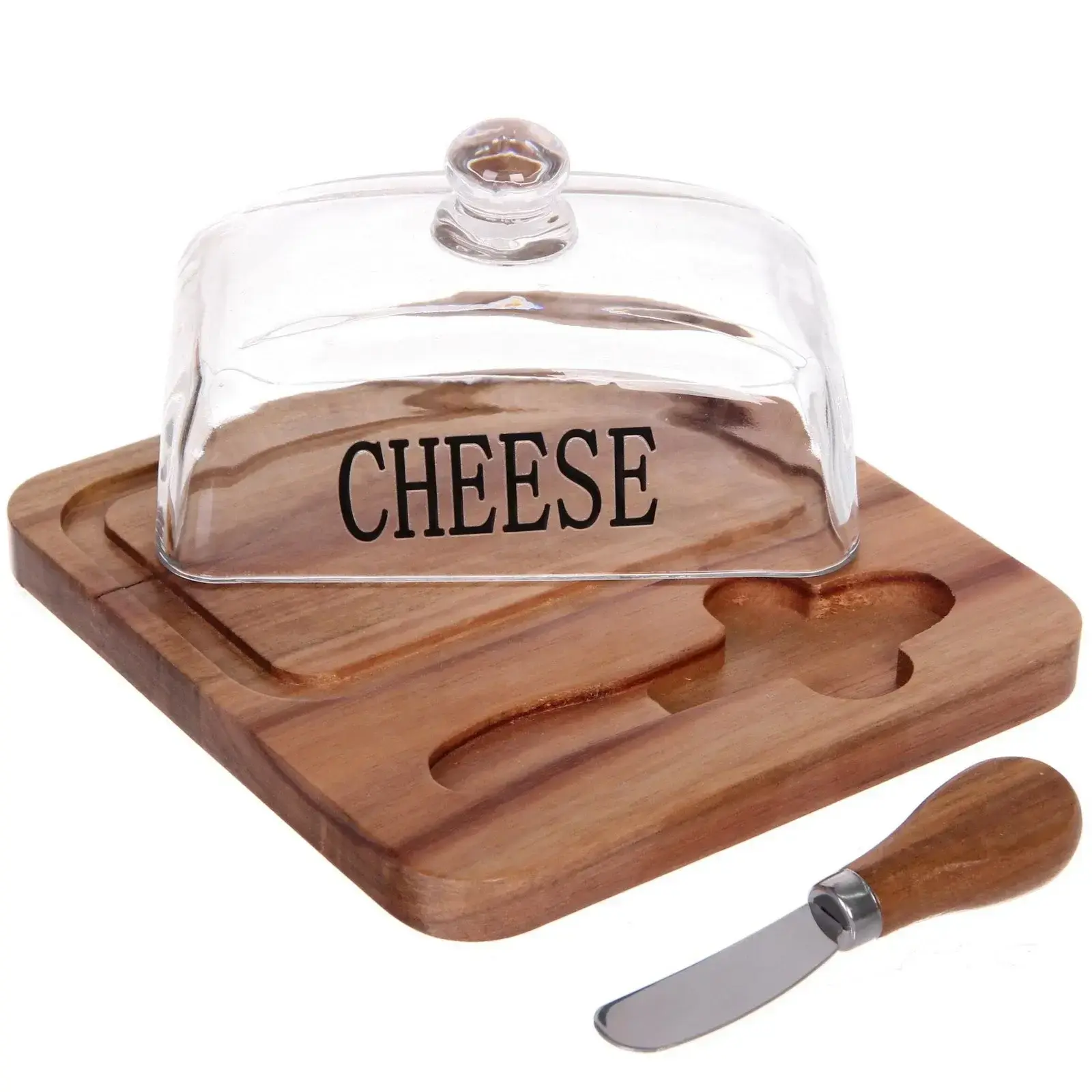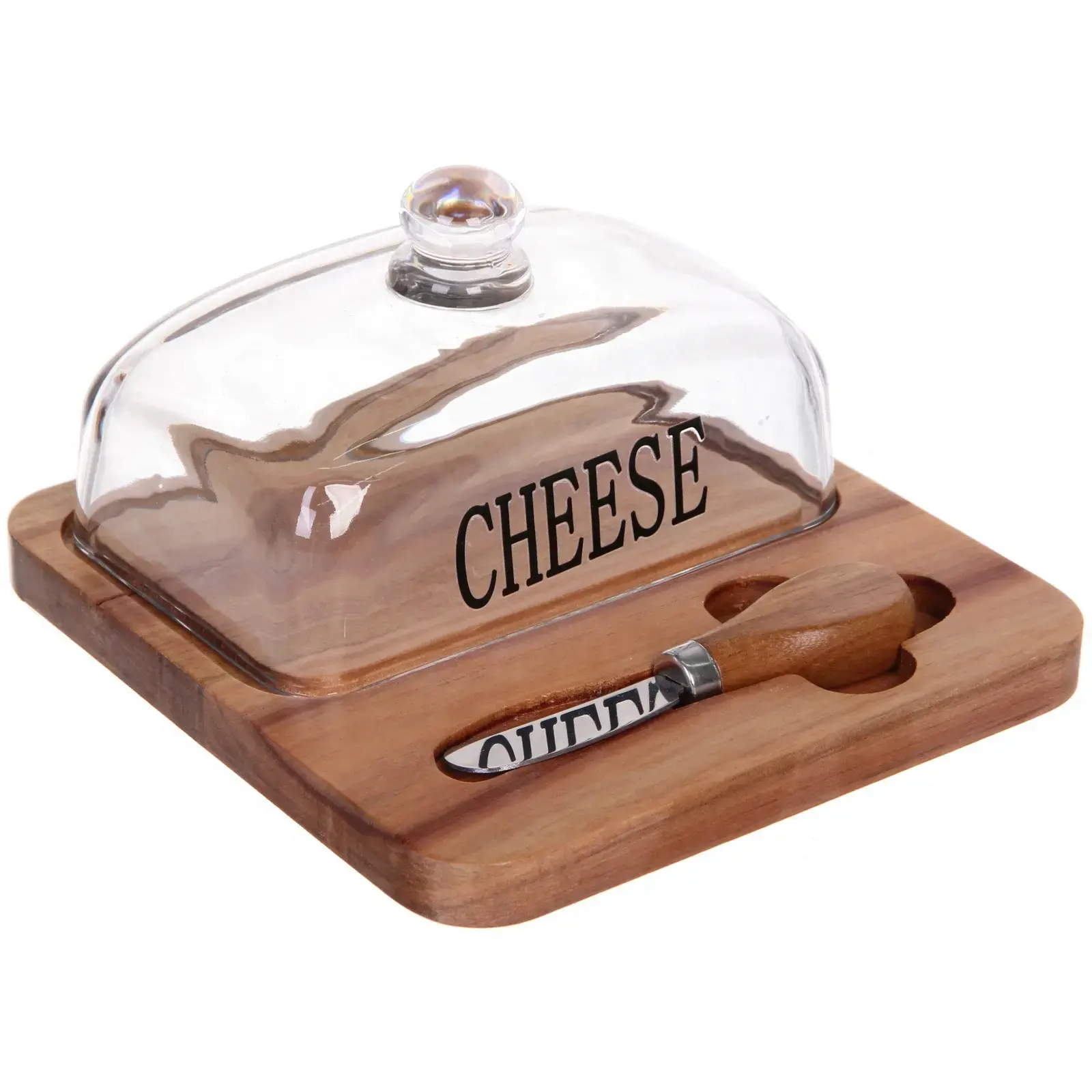 Квадратная форма подставки с закруглёнными углами органично вписывается в современный интерьер. Стеклянная крышка с круглой ручкой обеспечивает лёгкий доступ к содержимому. Нож с деревянной ручкой гарантирует комфортную нарезку даже твёрдых сортов сыра.