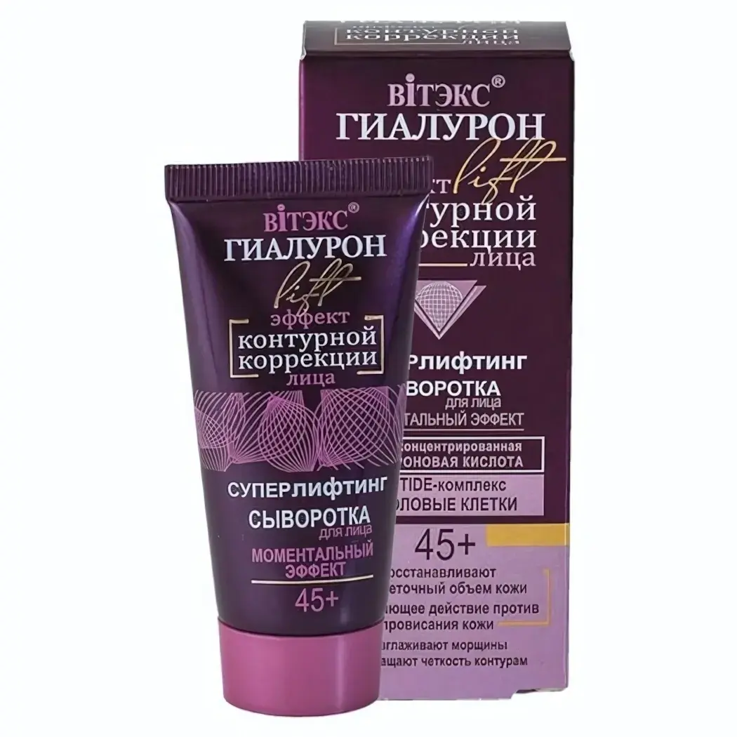 Сыворотка с концентрированной гиалуроновой кислотой и TIDE-комплексом создает эффект контурной коррекции, подтягивая овал лица уже после первого применения. Идеально подходит для возрастной кожи 45+.