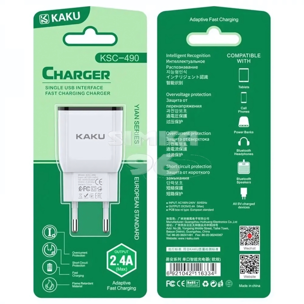 Выбирая KAKU KSC-490, вы получаете не только быстрое зарядное устройство, но и защиту от перенапряжения и короткого замыкания. Это гарантирует безопасность ваших устройств во время зарядки. Пластиковый корпус устройства обеспечивает долговечность и надежность в эксплуатации.
