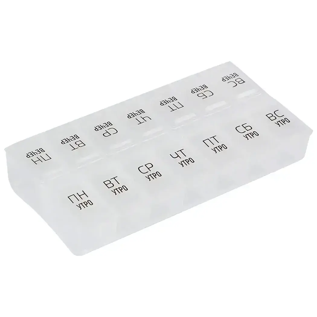 Пластиковый органайзер с 14 секциями поможет аккуратно распределить лекарства на неделю. Прозрачные стенки позволяют быстро найти нужный отсек, а прочный материал защитит содержимое от влаги и повреждений.