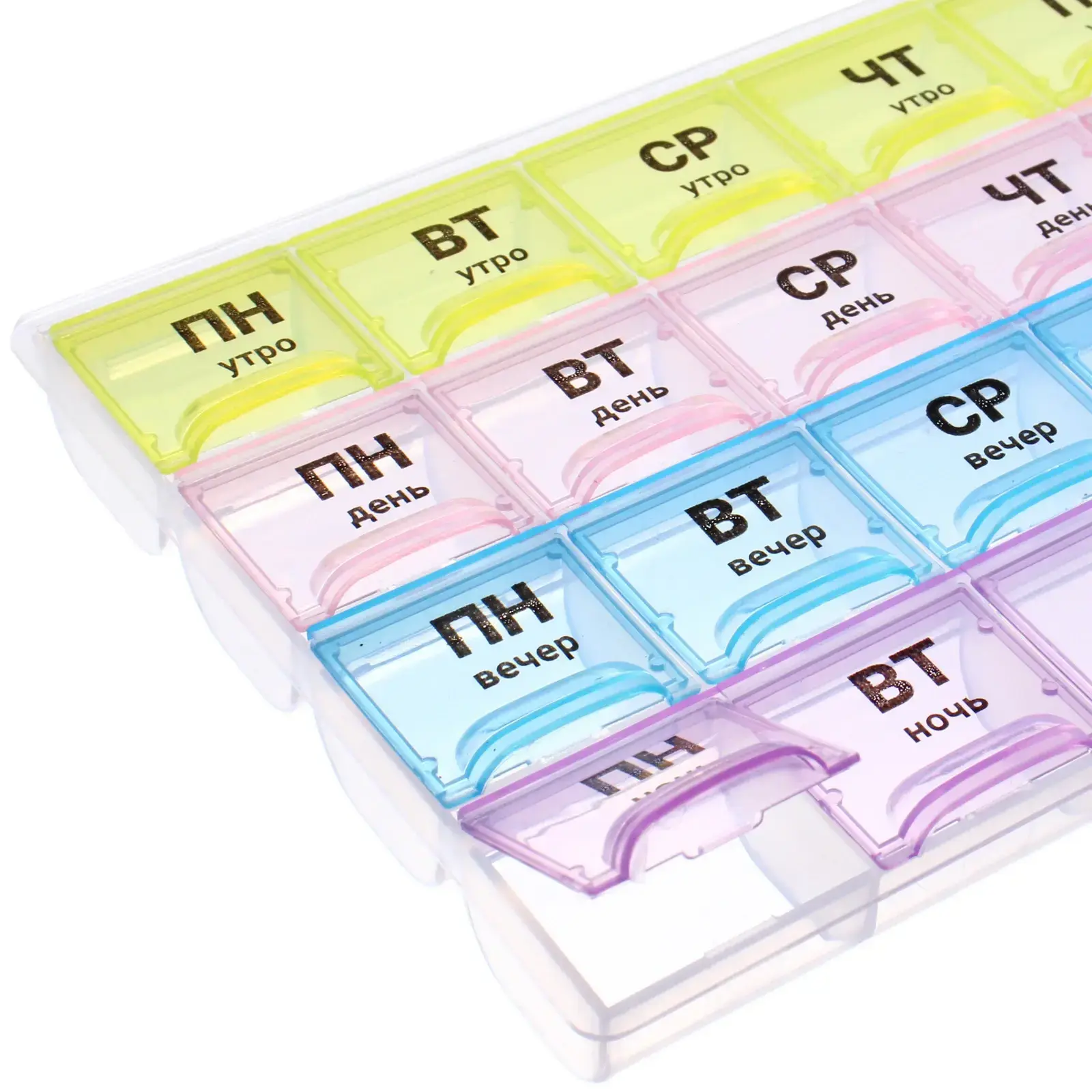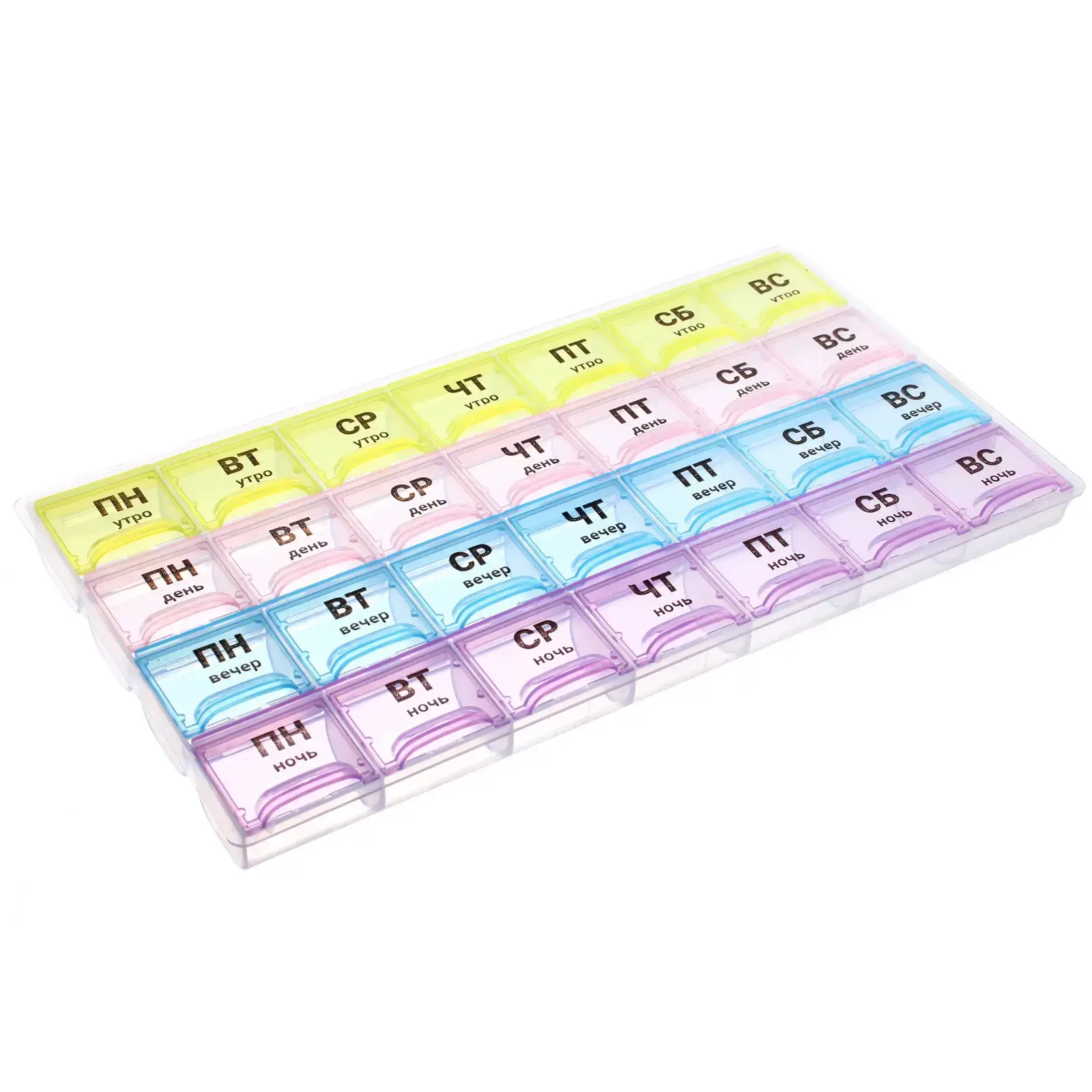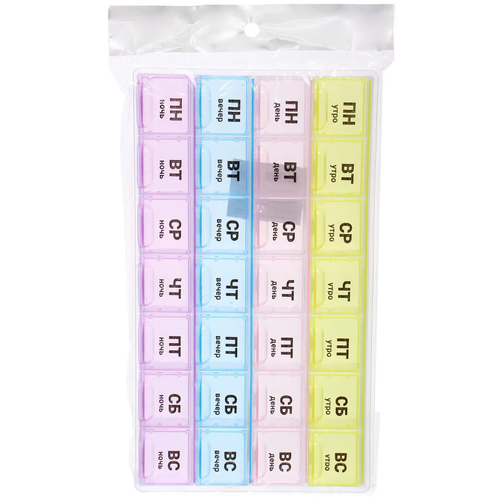 Органайзер разделен на 28 ячеек, каждая из которых обозначена днем недели и временем приема: утро, день, вечер и ночь. Это позволяет вам заранее подготовить все необходимые лекарства и не переживать о том, что что-то будет забыто. Таблетница выполнена из прочного и легкого пластика, что делает ее идеальной для использования как дома, так и в поездках. Благодаря компактным размерам 21,5х12х2,3 см, органайзер легко помещается в сумке или на столе.