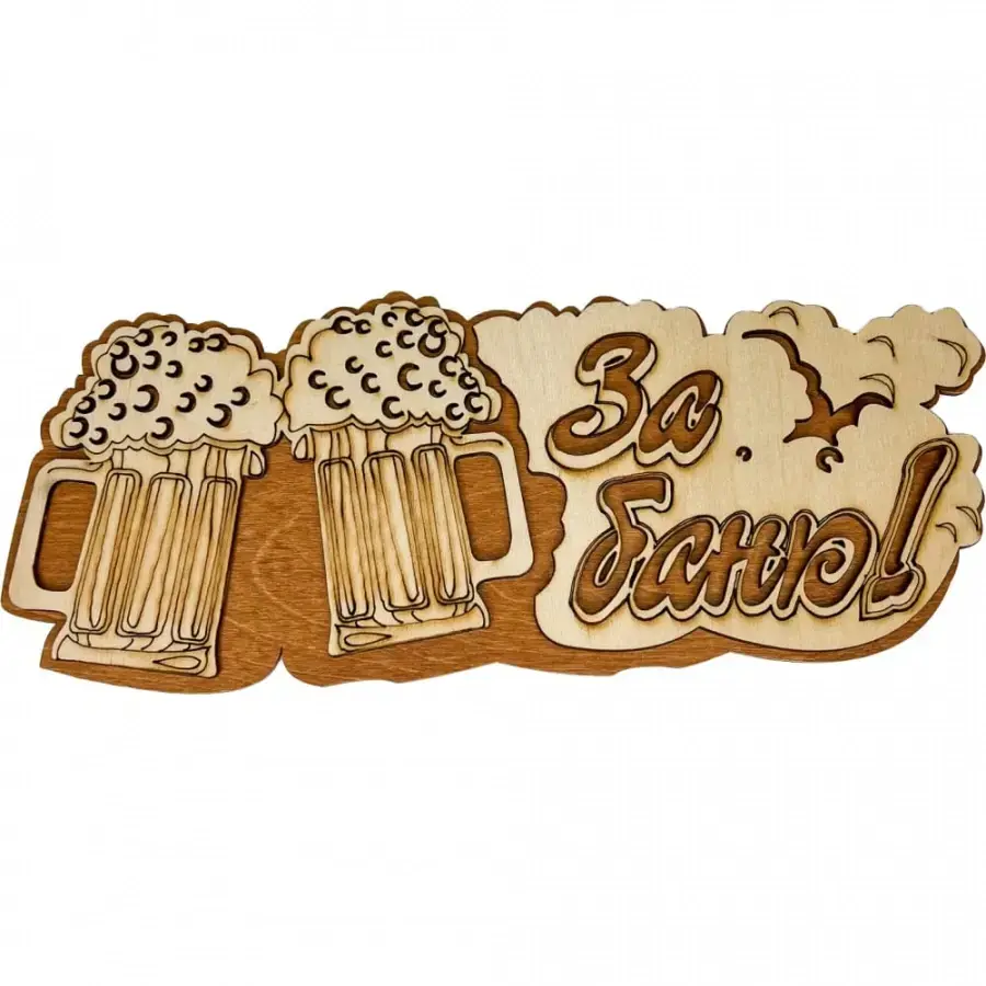 Размер таблички составляет 300 мм, что делает ее заметной, но не слишком громоздкой. Цветовая гамма включает светло-коричневые и темно-коричневые оттенки, что подчеркивает текстуру древесины и делает изделие стильным дополнением к любому интерьеру. Надпись «За баню!» выполнена в крупном шрифте, что делает ее хорошо читаемой и привлекает внимание.