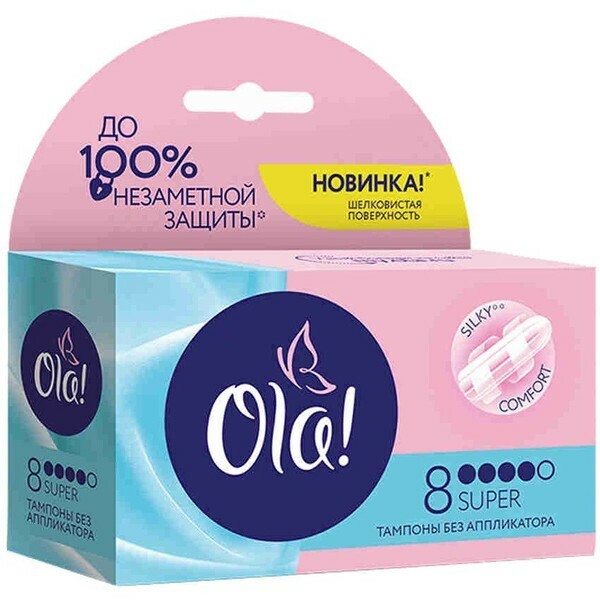 Тампоны OLA! SUPER с шелковистой поверхностью обеспечивают до 100% незаметной защиты, что делает их идеальным выбором для женщин, ценящих комфорт и уверенность в любой ситуации. Эти тампоны без аппликатора легко использовать и подходят для повседневного применения, обеспечивая надежную защиту в течение всего дня.