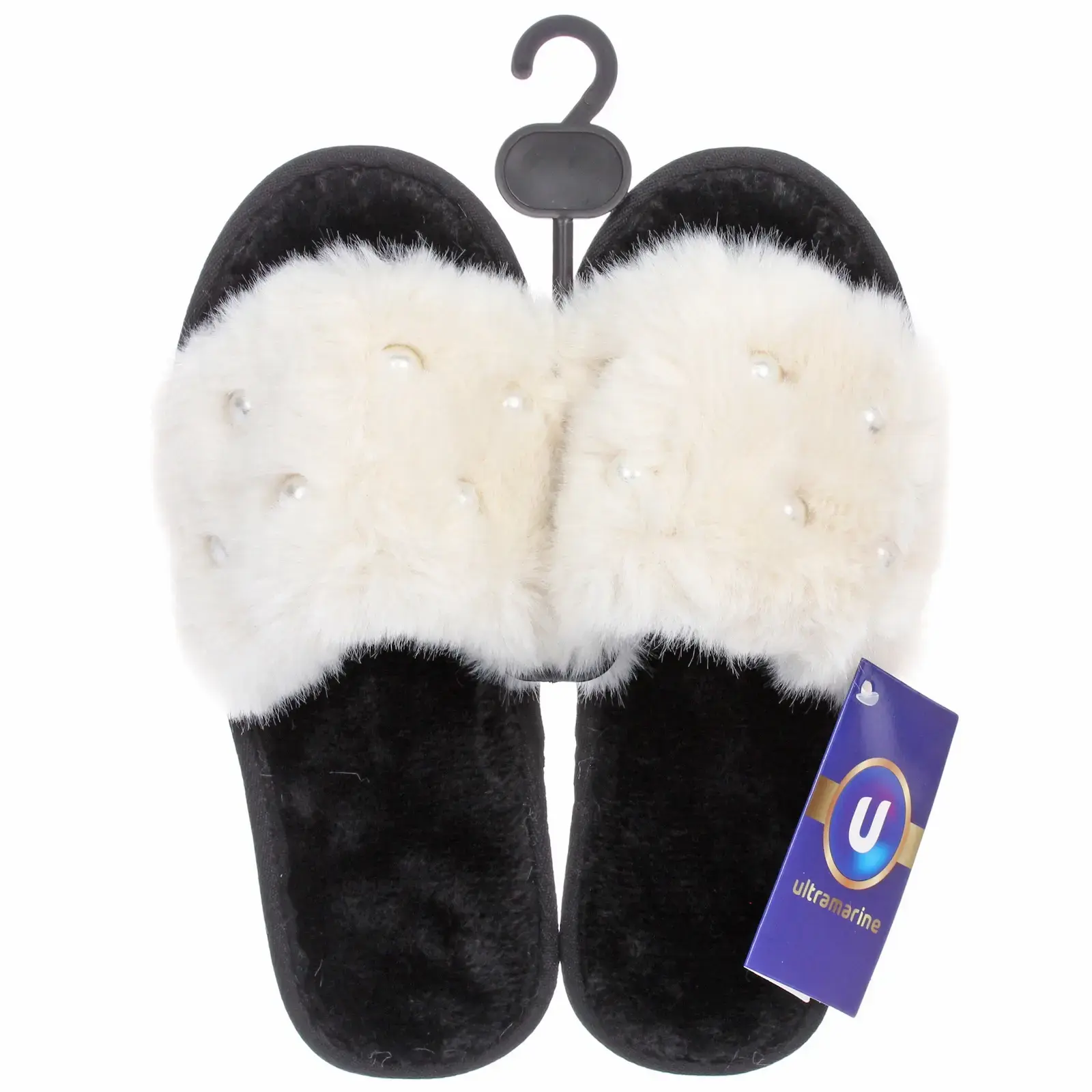 Тапочки имеют классический дизайн с черной подошвой и белоснежным верхом. Декоративные элементы в виде жемчужин делают модель не только практичной, но и стильной.