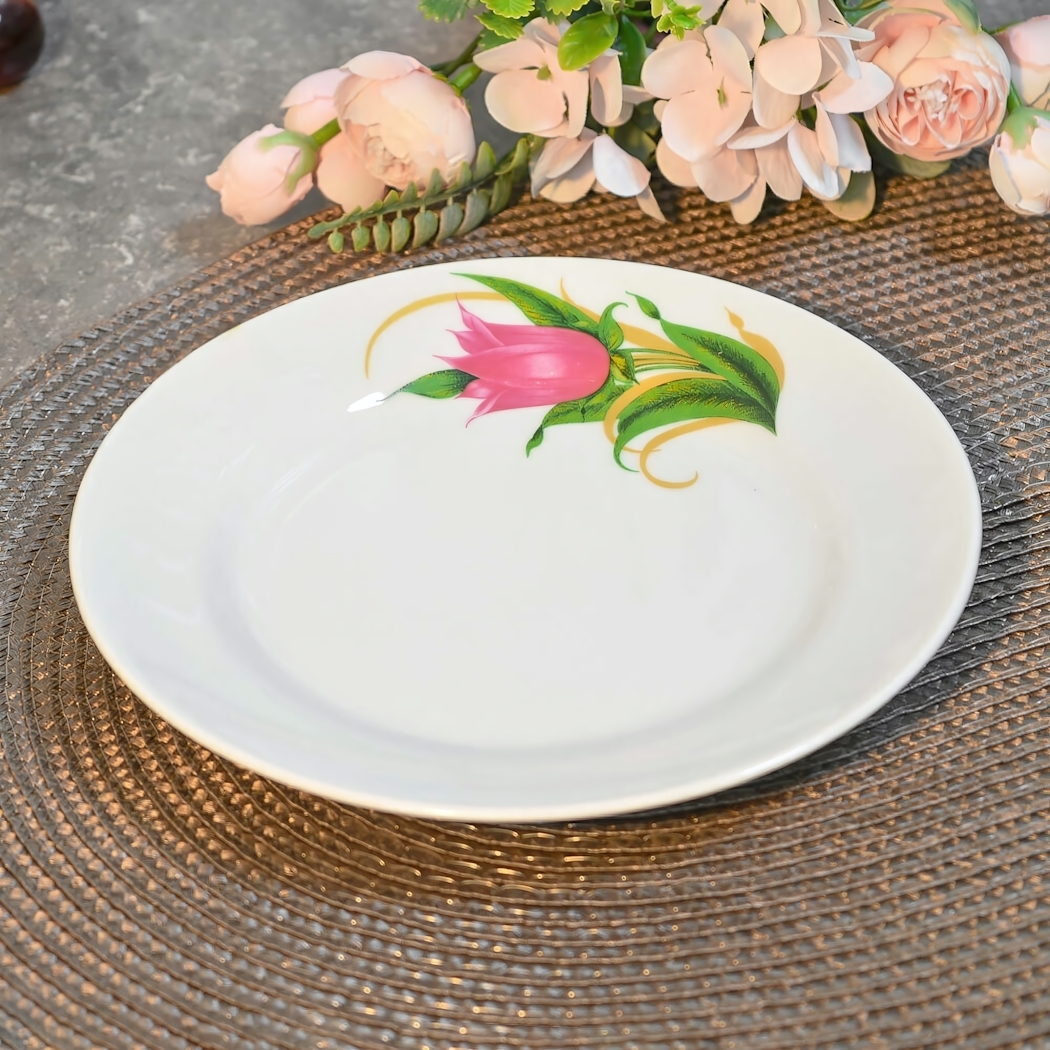 Эта изысканная тарелка станет настоящим украшением вашего стола. Выполненная из качественного белого фарфора, она сочетает в себе элегантность и практичность. Цветочная роспись с изображением розового цветка, обрамленного зелеными листьями и желтыми завитками, добавляет нотку свежести и уюта в любое застолье.