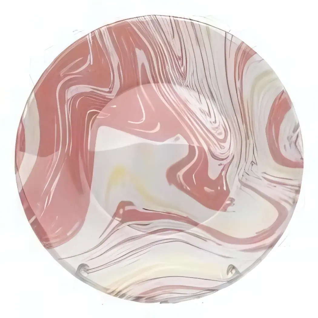 Эта тарелка станет не только практичным элементом сервировки, но и настоящим украшением вашего стола. С мраморным узором в розовых, белых и бежевых оттенках, она добавит изысканности и современности в любой интерьер. Благодаря гладкой и блестящей поверхности, тарелка легко очищается и подходит для повседневного использования.