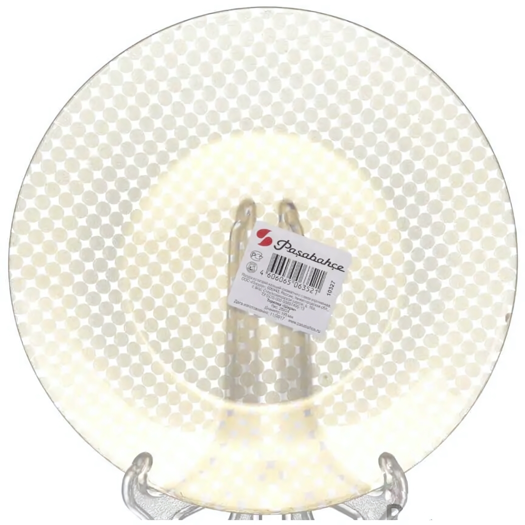 Прозрачное стекло с лёгким жемчужным отливом гармонирует с любой посудой. Точечный орнамент по краю добавляет объём и визуальную глубину, превращая обычную тарелку в элемент декора. Форма изделия разработана с учётом эргономики — удобно держать и переносить даже заполненную посуду.