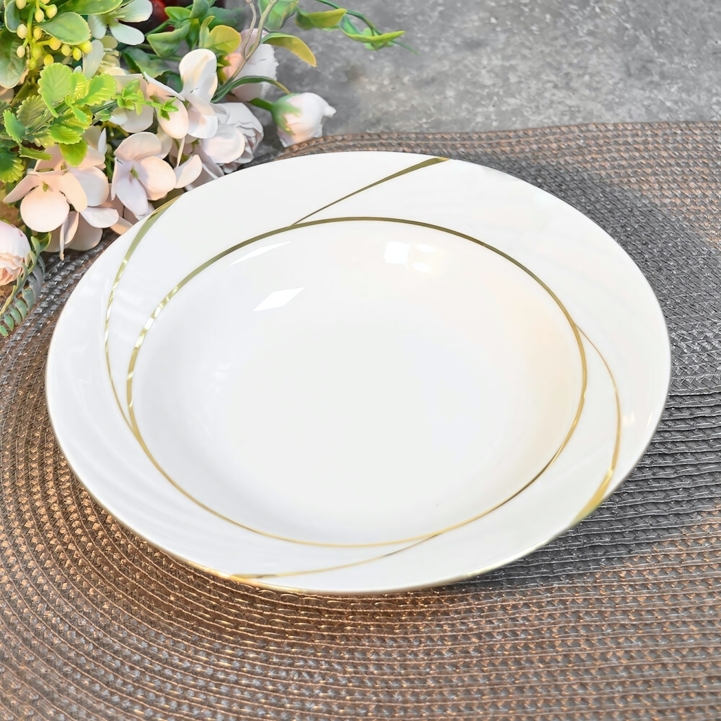 Представляем вам глубокую тарелку диаметром 200мм из фарфора 'Голубка Бомонд'. Эта тарелка станет идеальным дополнением вашего стола, добавляя нотку изысканности и стиля. Благодаря своему элегантному дизайну с золотыми линиями, она не только функциональна, но и привлекает внимание, создавая атмосферу праздника и уюта.