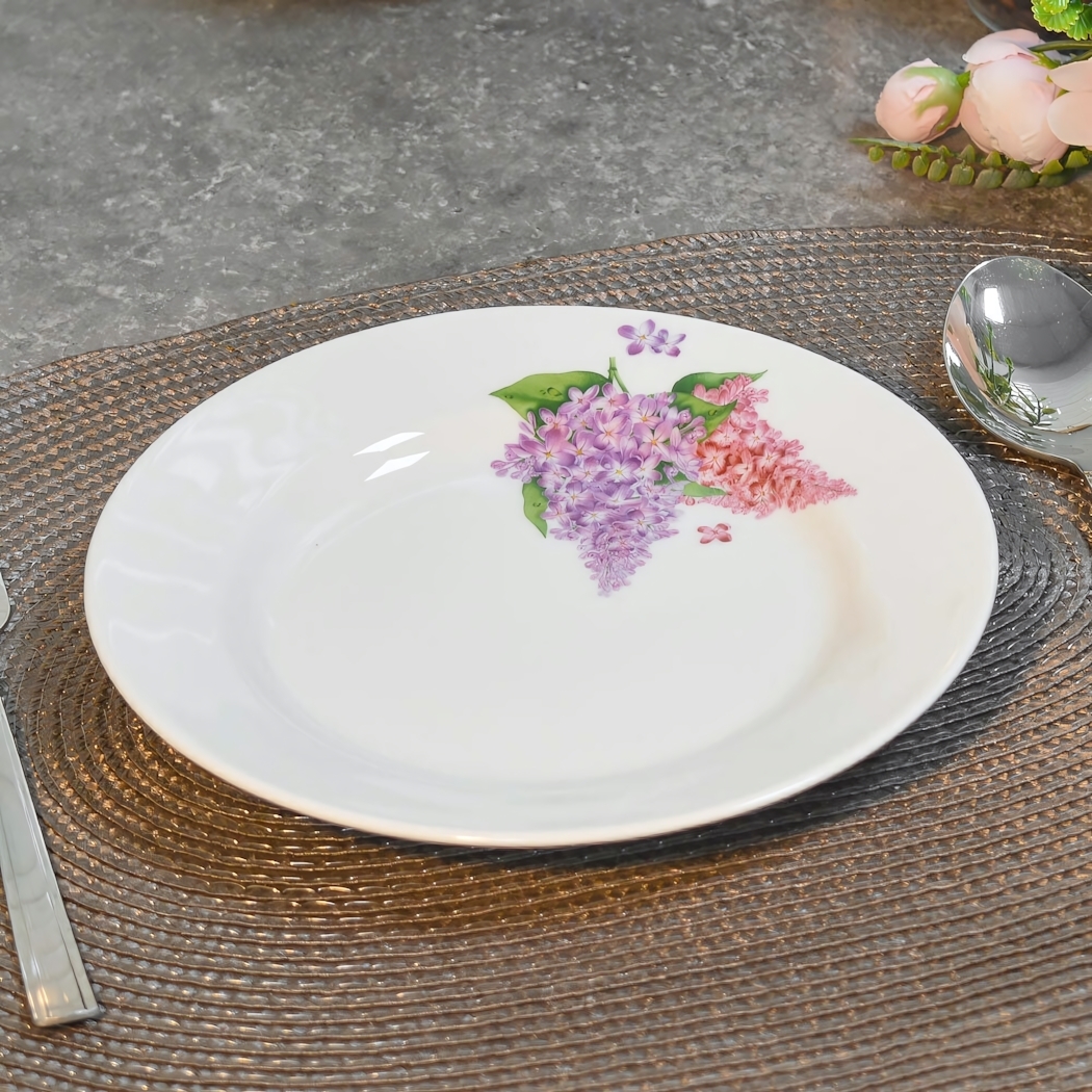 Фарфоровая тарелка серии «Сирень» сочетает в себе изысканный дизайн и практичность. Нежный цветочный орнамент с фиолетово-розовыми соцветиями добавит уюта как праздничному столу, так и повседневной трапезе. Идеальный диаметр 20 см подходит для подачи вторых блюд, закусок или десертов.