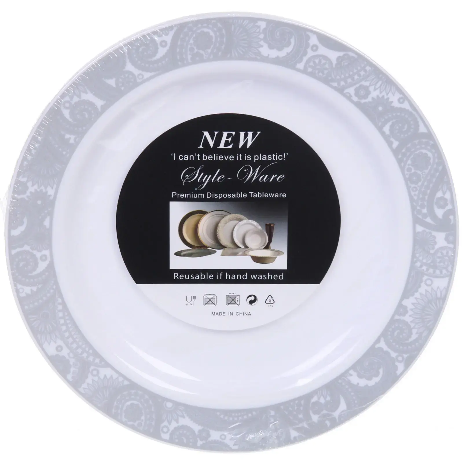 Набор состоит из 5 тарелок диаметром 23см каждая. Изделия выполнены из высококачественного пластика с декоративным серебристым орнаментом по краю. Благодаря специальной технологии производства, поверхность тарелок устойчива к механическим повреждениям и сохраняет презентабельный внешний вид.