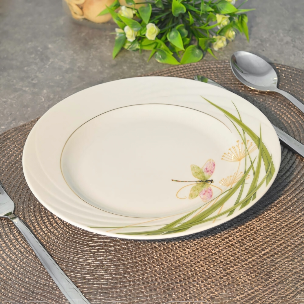 Превратите каждую трапезу в праздник с тарелкой из коллекции 'Стрекоза'. Утонченный дизайн с нежным рисунком и золотистой окантовкой станет изысканным дополнением вашей сервировки.