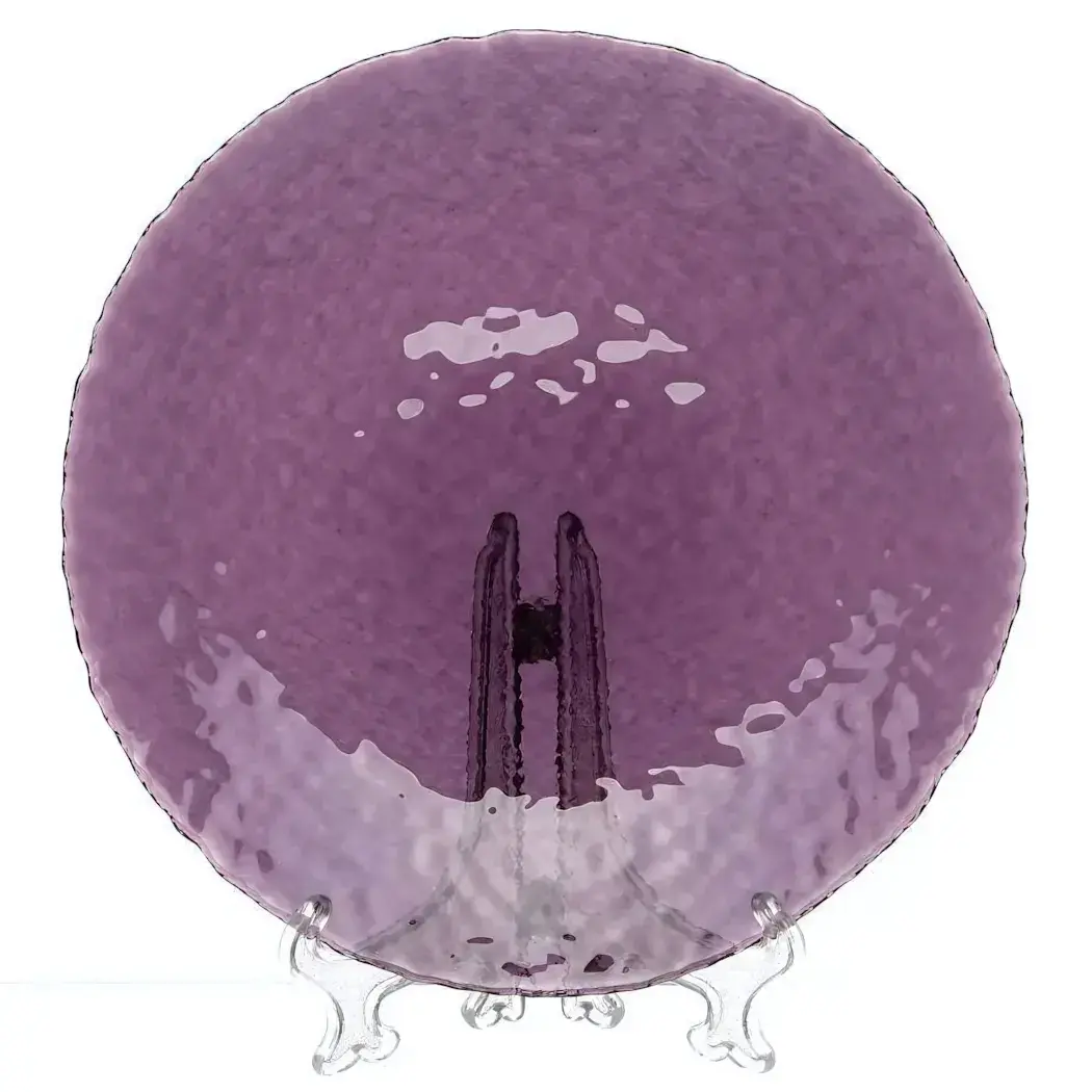 Волнистый край толщиной 3 мм придает изделию объемный силуэт, а прозрачное стекло с легким фиолетовым оттенком создает эффект драгоценного камня. Отсутствие декоративных элементов делает тарелку универсальной для любого стиля сервировки.