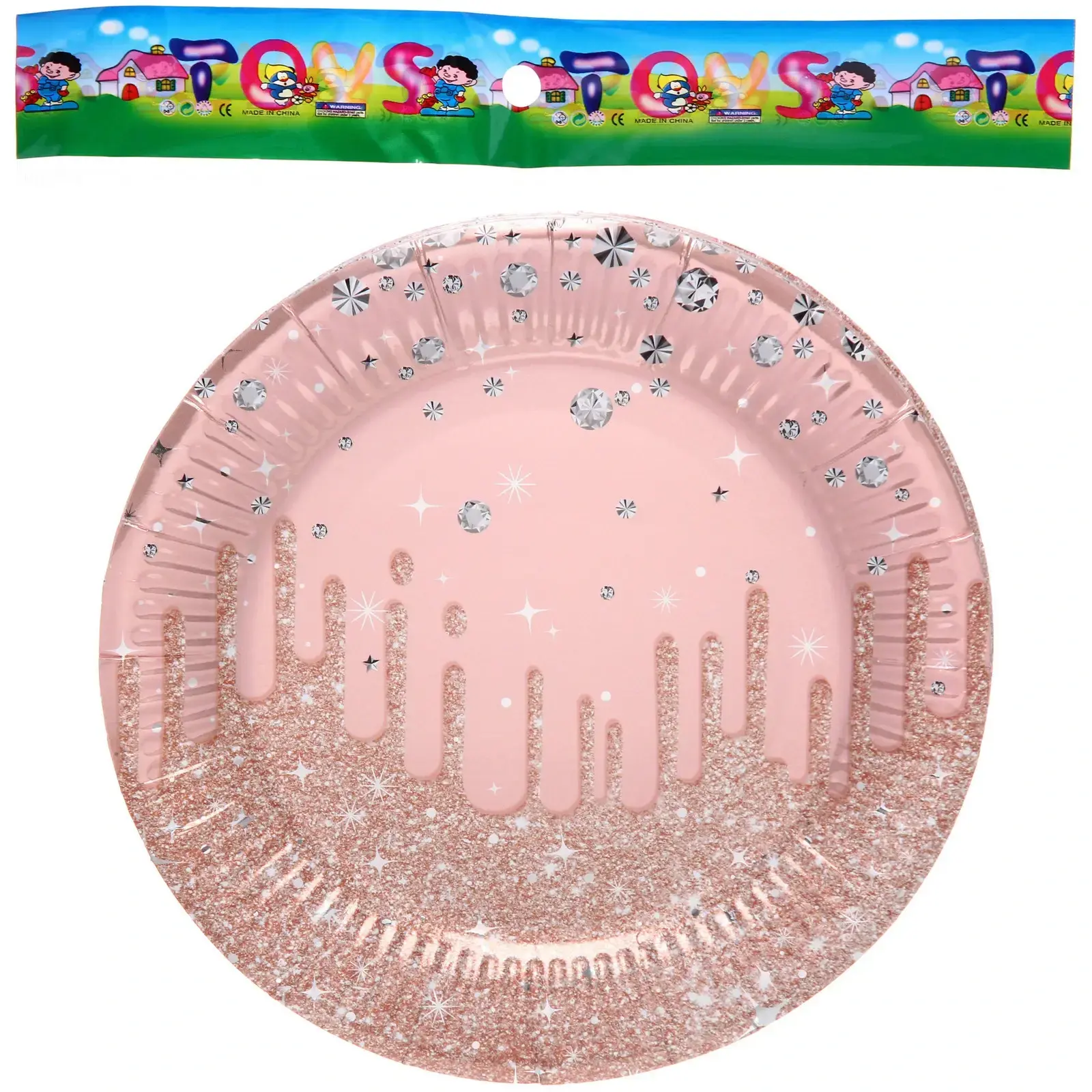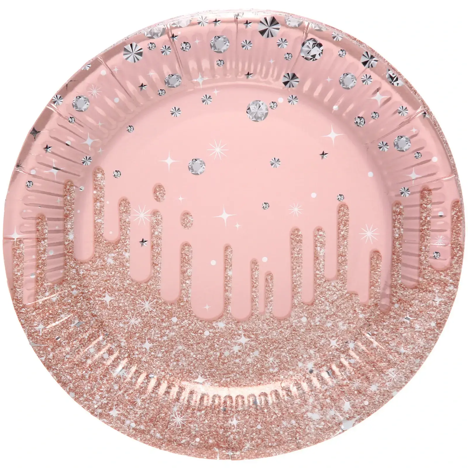 Добавьте волшебства на ваш стол с праздничной бумажной тарелкой «Галактика» диаметром 18 см. Её утончённый розовый цвет с эффектом розового золота и блестящими элементами создаст атмосферу изысканности и радости. Дизайн с имитацией стекания блесток, звёздами и кристаллами привлечёт внимание гостей и станет стильным акцентом сервировки.