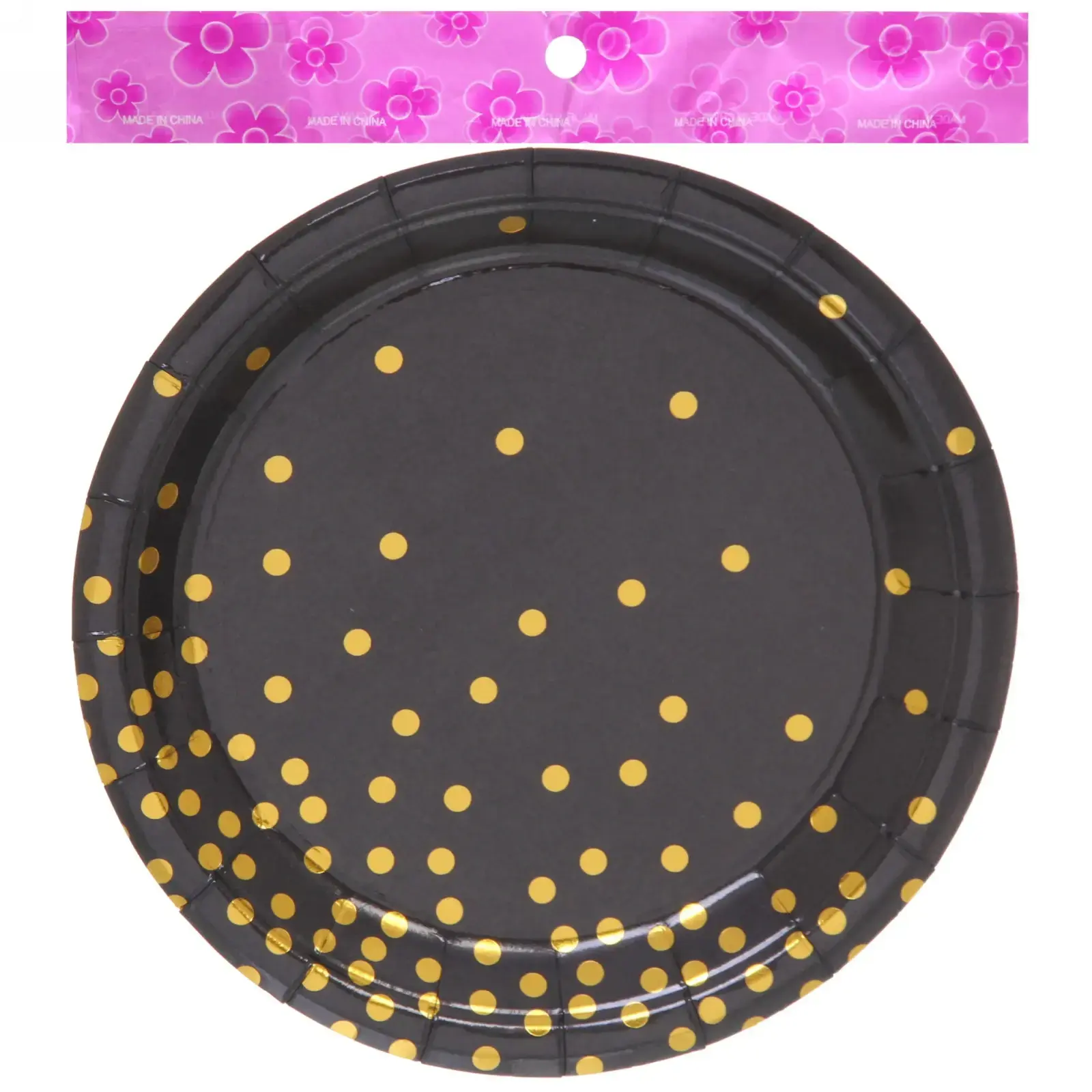 Набор бумажных тарелок «Конфетти» сочетает в себе стильный дизайн и практичность. Черные тарелки с золотыми точками создадут атмосферу роскоши на любом мероприятии — от семейного ужина до свадебного банкета. Устойчивая конструкция с рифленым краем обеспечивает удобное использование даже для жидких блюд.