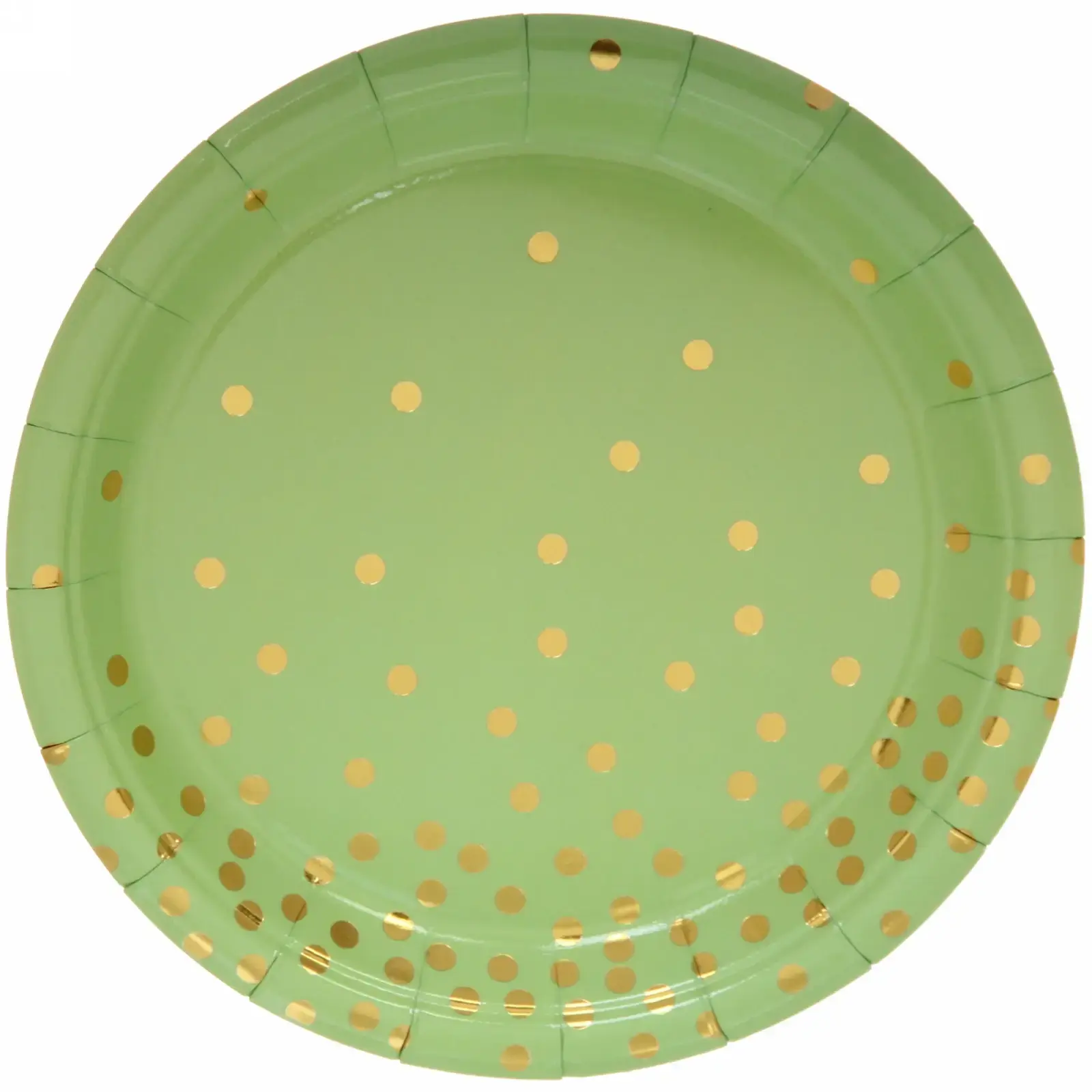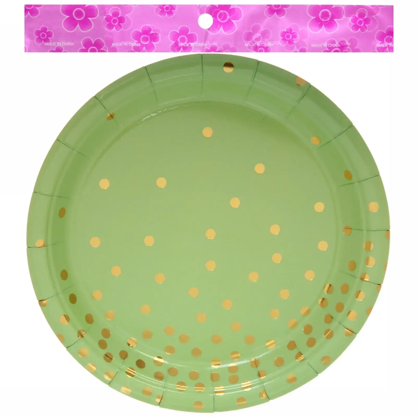 Праздничные моменты требуют особого подхода, и наши бумажные тарелки «Конфетти» станут идеальным решением для вашего мероприятия. Сочетание светло-зеленого цвета и золотых точек придаст вашему столу стильный и современный вид, создавая атмосферу уюта и радости.