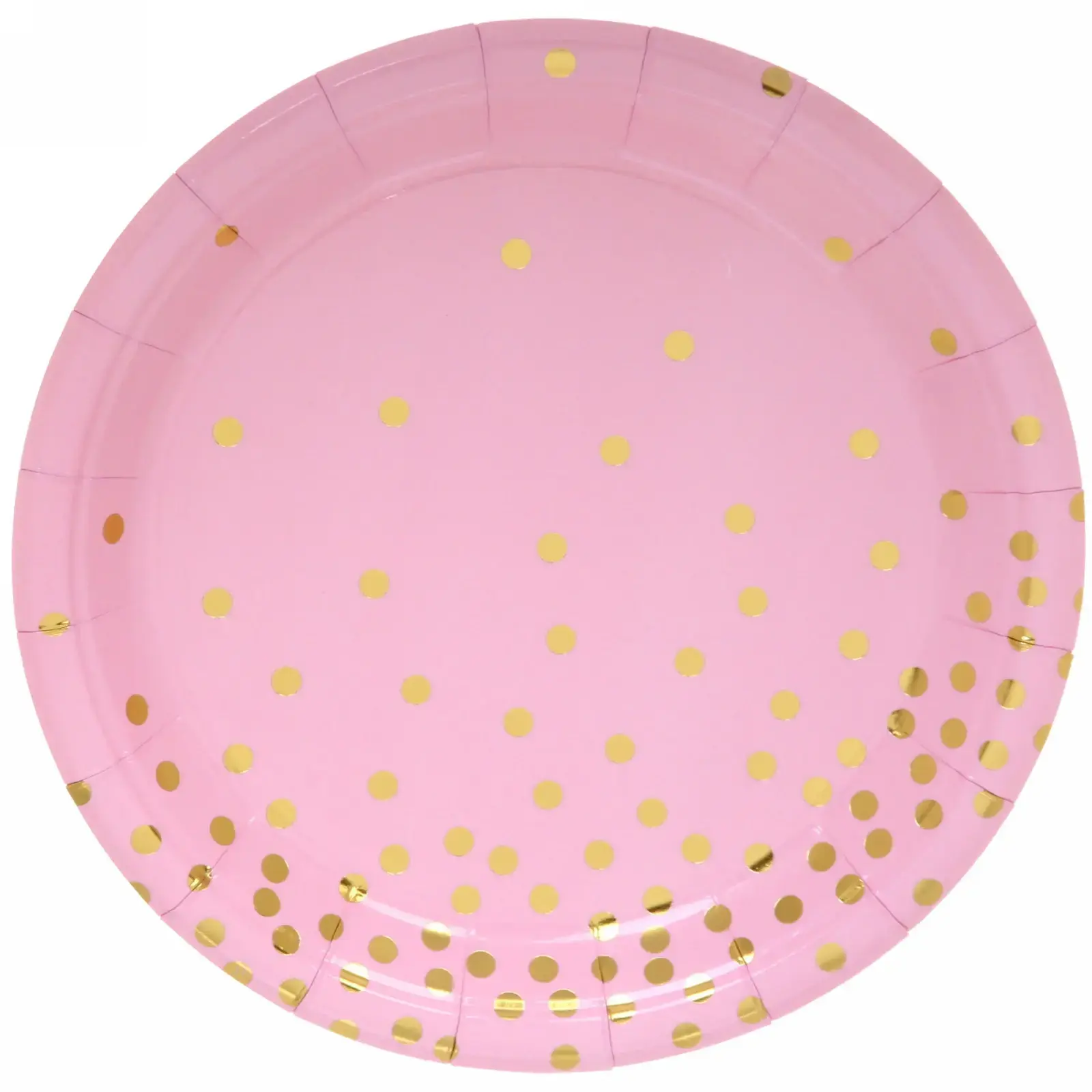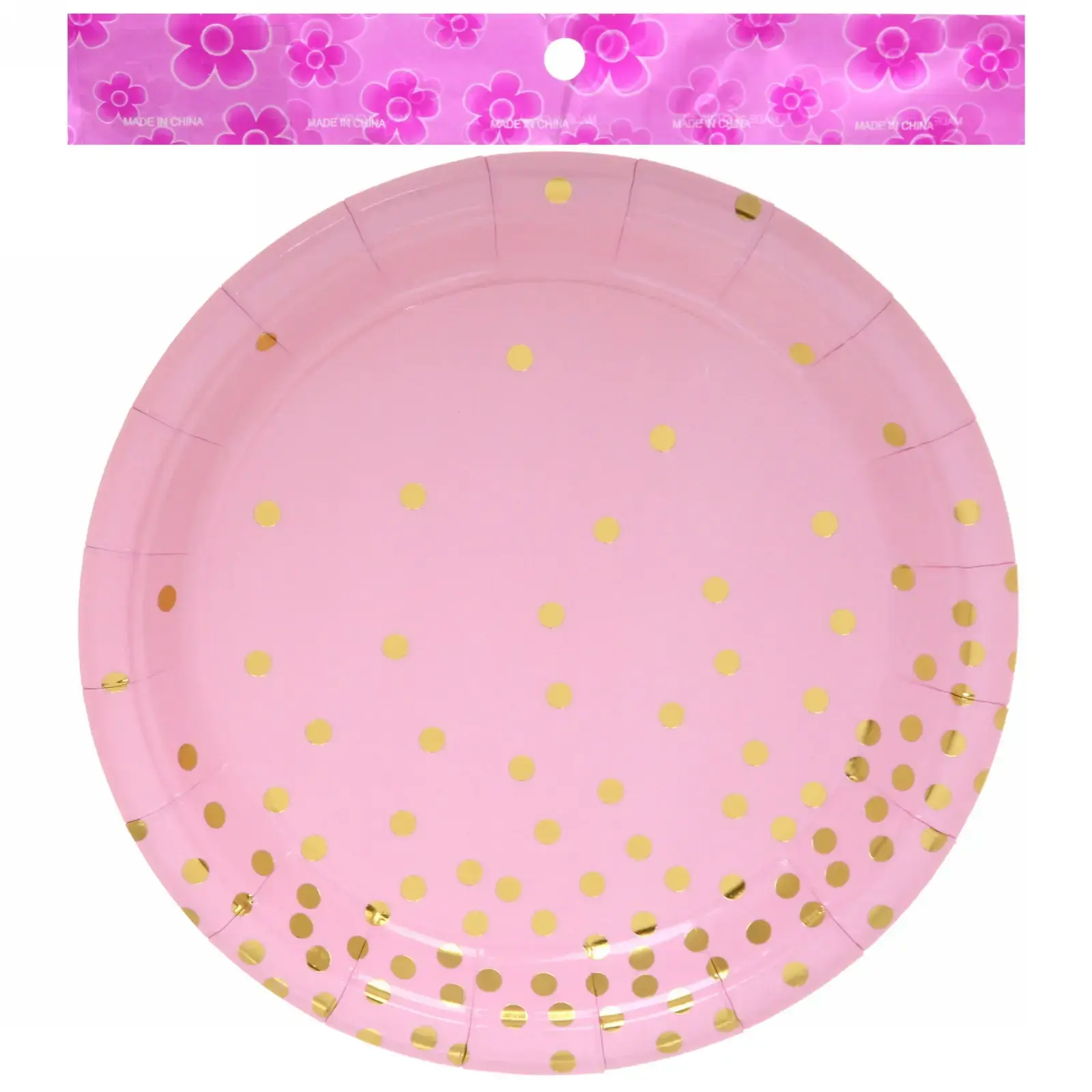 В наборе вы получите 10 тарелок, что делает его идеальным выбором для небольших и средних мероприятий. Ярко-розовый цвет с золотыми точками добавляет изысканности и стиля, а круглая форма делает их универсальными для любого типа сервировки. Размер каждой тарелки составляет 18 см, что позволяет удобно подавать разнообразные блюда.