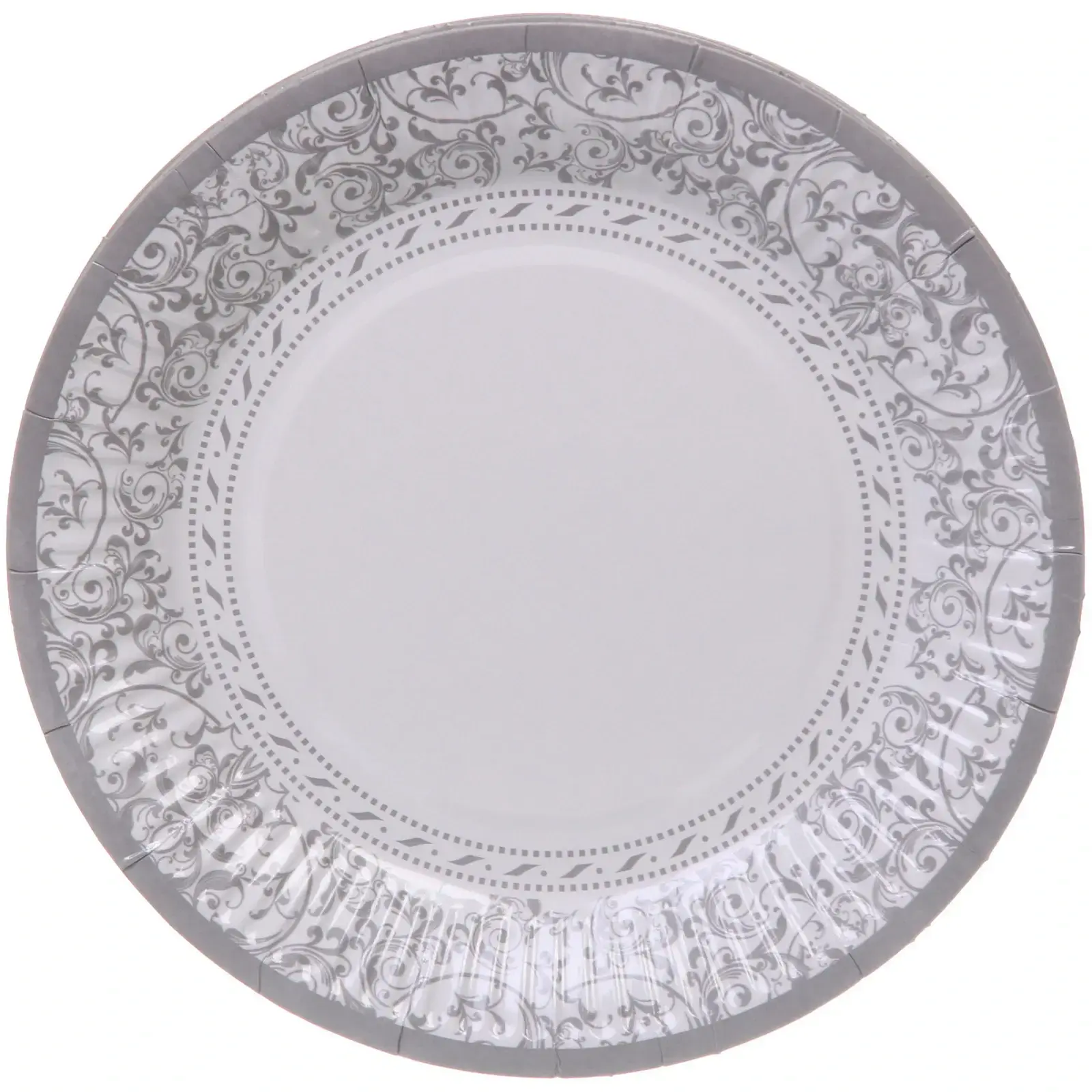 Выбирая наши тарелки, вы получаете не только стильный элемент сервировки, но и практичное решение для вашего праздника. Они изготовлены из качественной бумаги, что обеспечивает надежность и долговечность. Серебристый орнамент добавляет изысканности, а белый фон позволяет легко сочетать тарелки с любыми другими элементами декора.