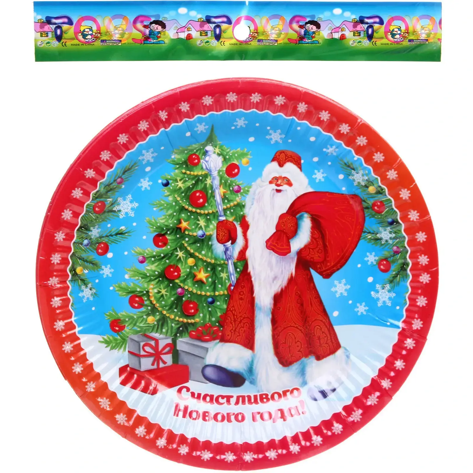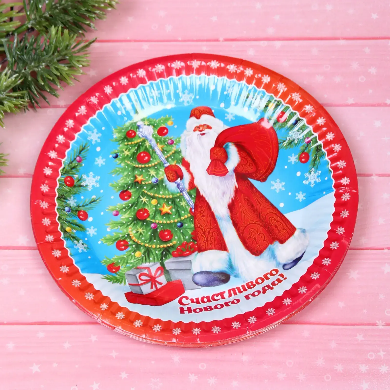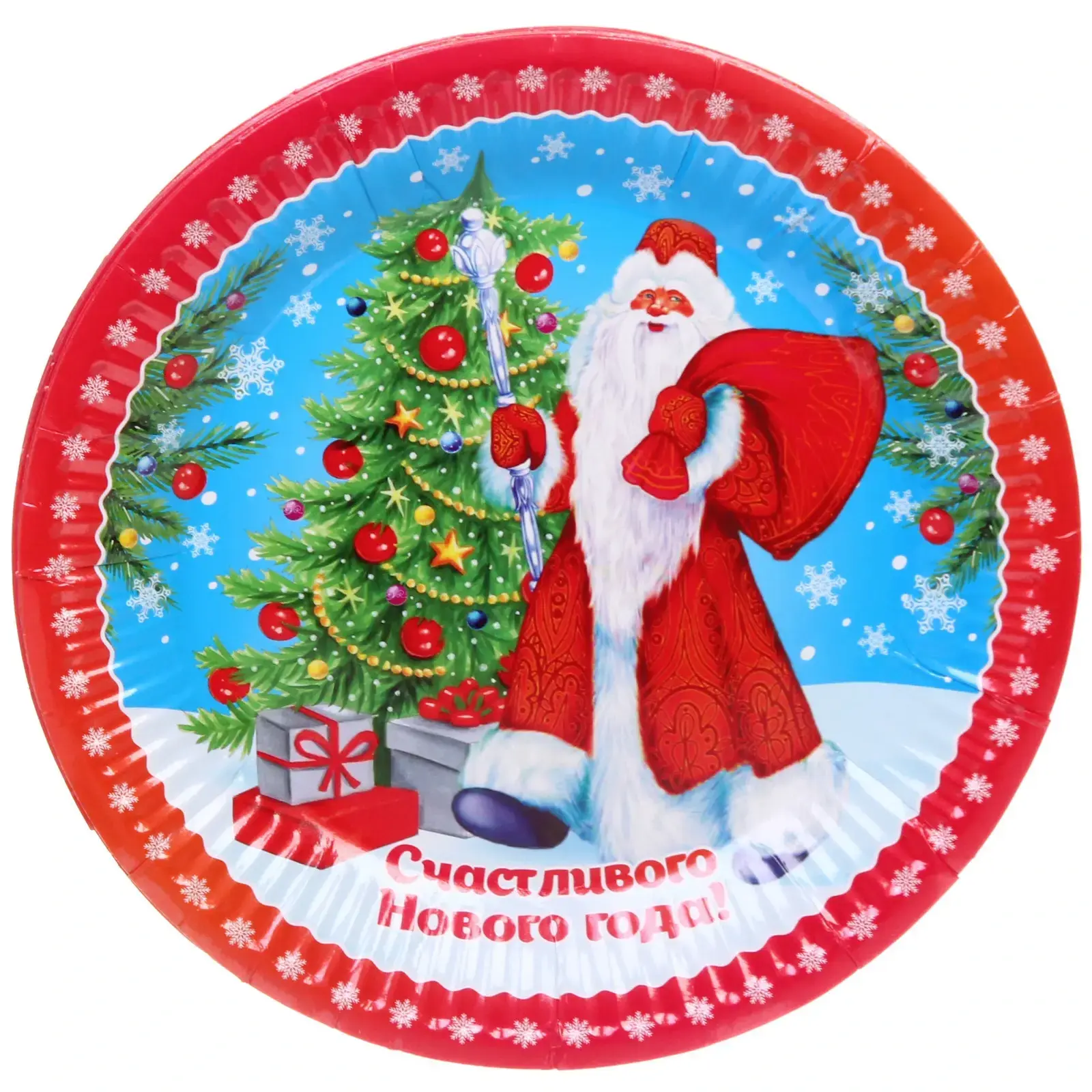 Тарелка диаметром 18 см выполнена из качественной бумаги, что делает её легкой и удобной в использовании. Она идеально подходит для подачи закусок, десертов и других блюд на новогоднем празднике. Благодаря яркому дизайну с Дедом Морозом и новогодней елкой, тарелка станет не только практичным, но и стильным элементом вашего стола.