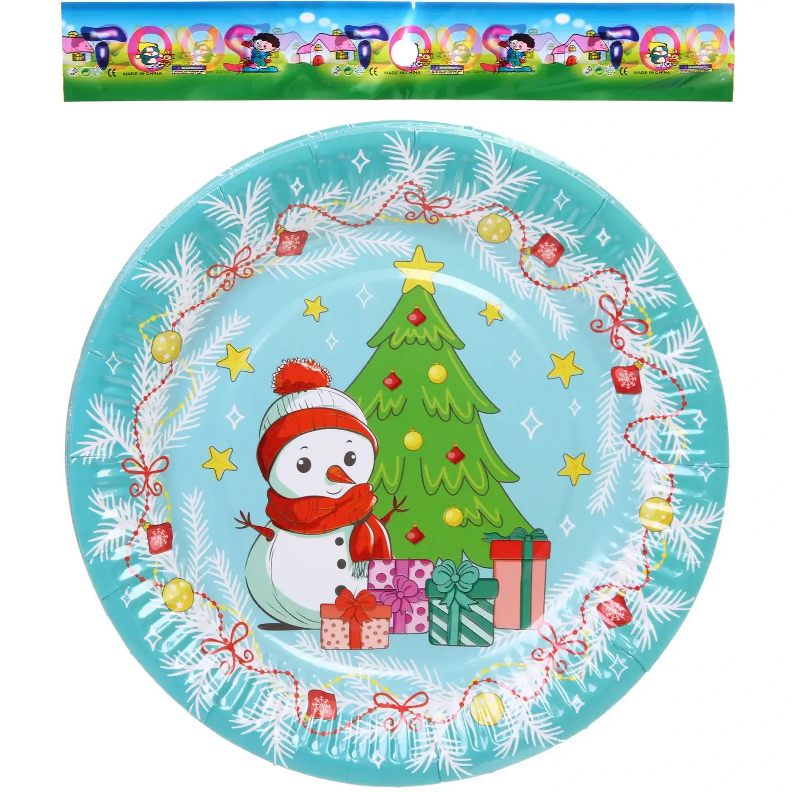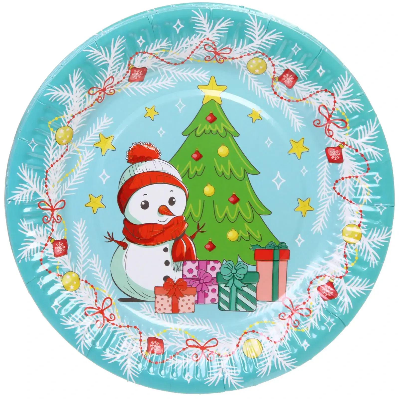Тарелка имеет диаметр 18 см и выполнена из бумаги, что делает её легкой и удобной в использовании. Дизайн включает в себя яркие изображения снеговика, новогодней ёлки и подарков, что добавляет веселья и радости в атмосферу праздника. Эти тарелки идеально подходят для сервировки на детских праздниках, семейных встречах и новогодних вечеринках.
