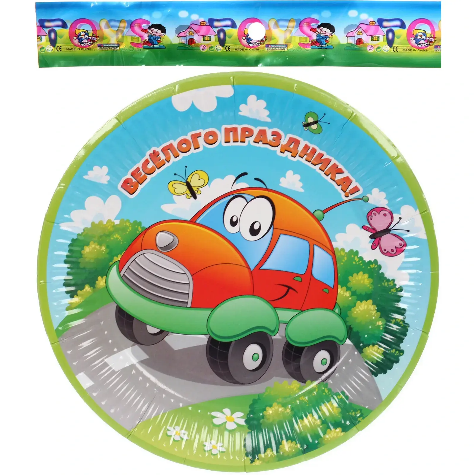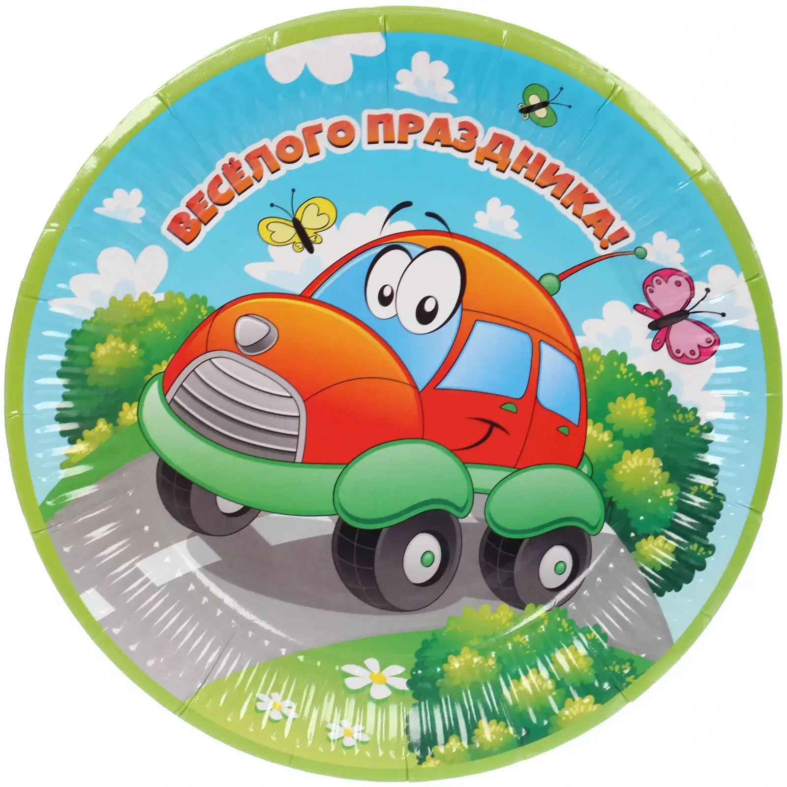 Тарелка бумажная 18см "Веселая машинка", яркий принт для детских праздников, 10шт