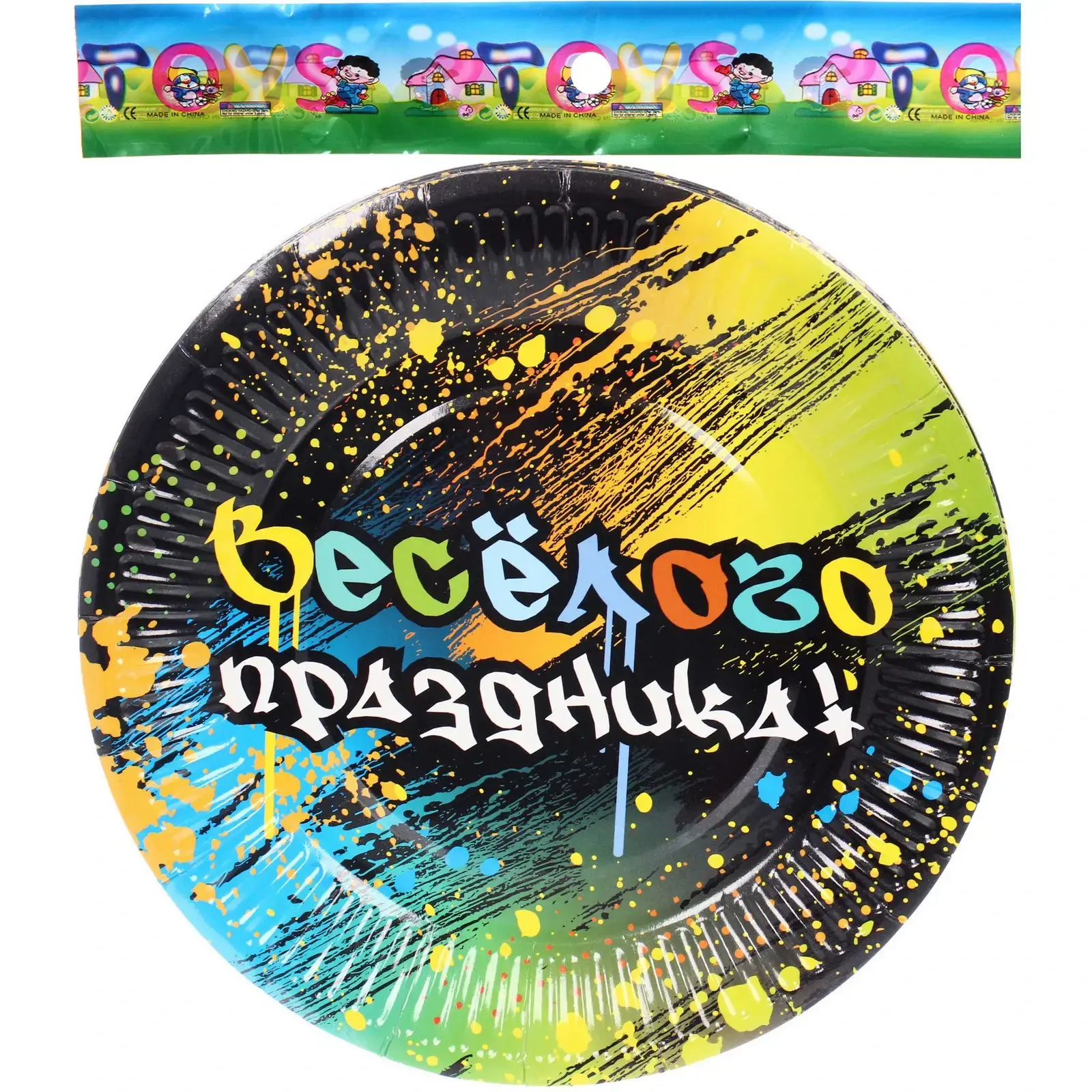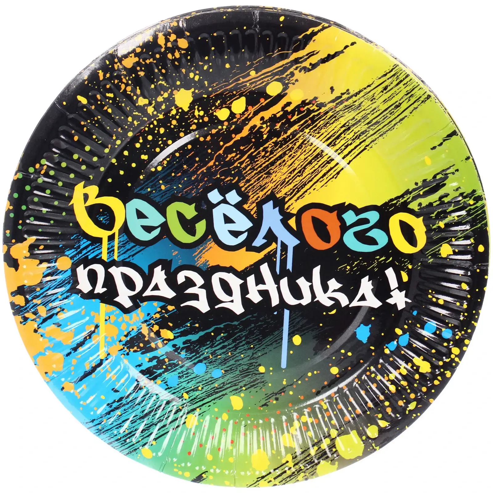 Порадуйте гостей яркими одноразовыми тарелками 'Веселого праздника', которые привнесут в ваше торжество особое настроение. Благодаря стильному дизайну в виде разноцветных мазков и забавной надписи, выполненной в стиле граффити, эти тарелки станут не просто посудой, а настоящим украшением вашего стола.