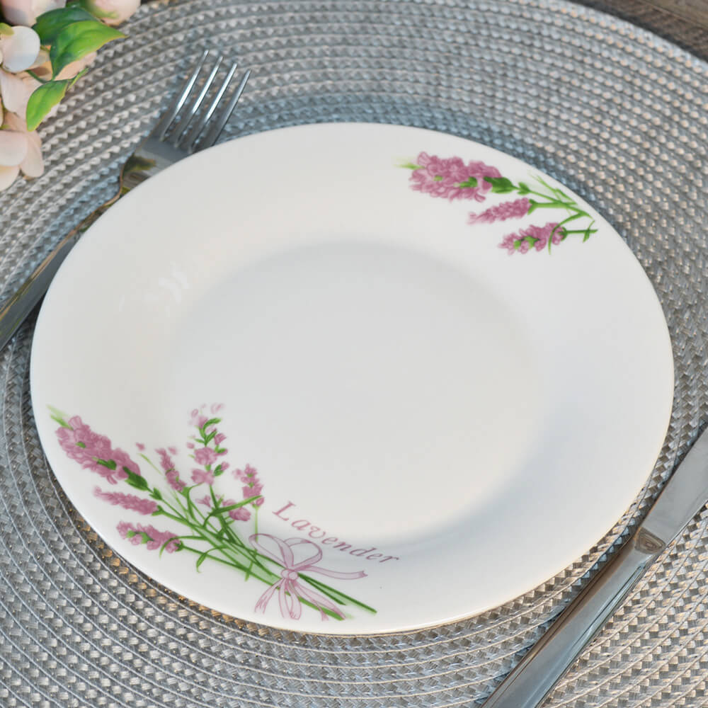 Диаметр тарелки – 20,5 см. Цвет – белый с нежным сиренево-розовым рисунком лаванды и зеленых стеблей. Изготовлена из качественного фарфора, устойчивого к ежедневному использованию. Оптимальный размер для десертов и порционных закусок.