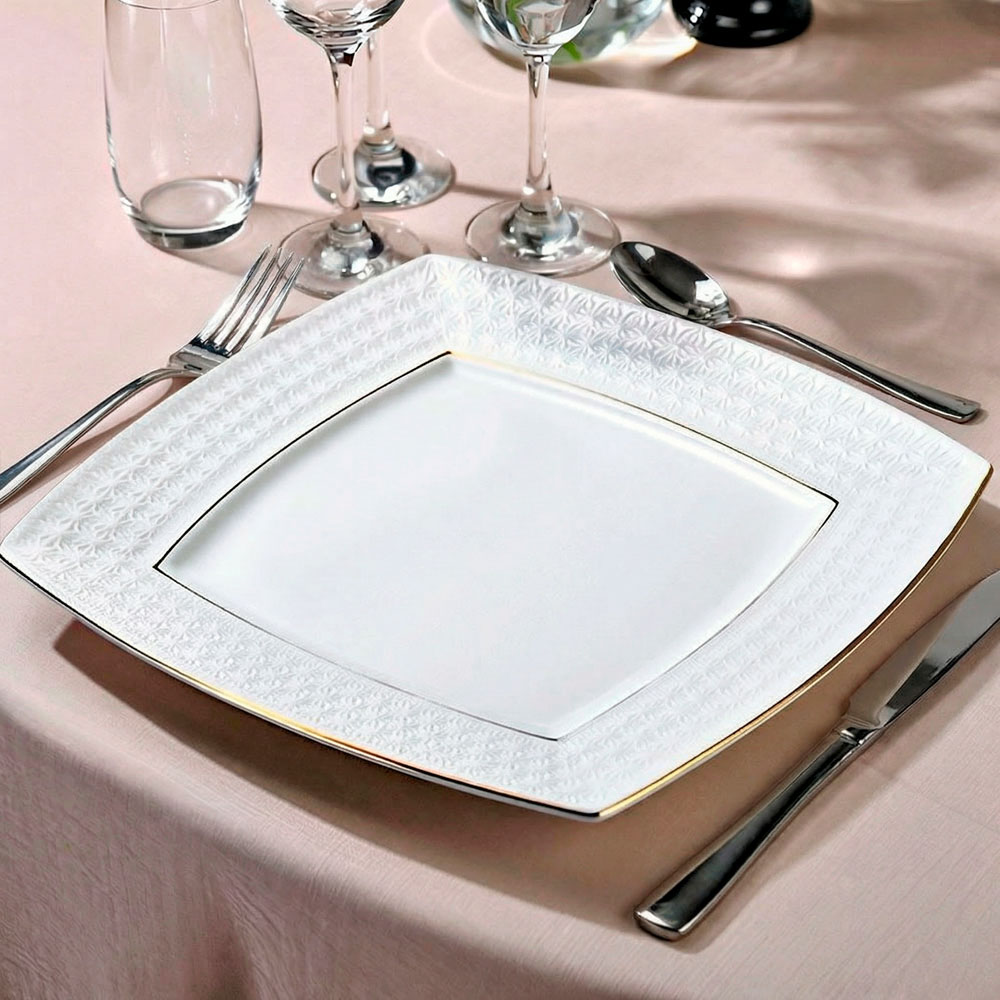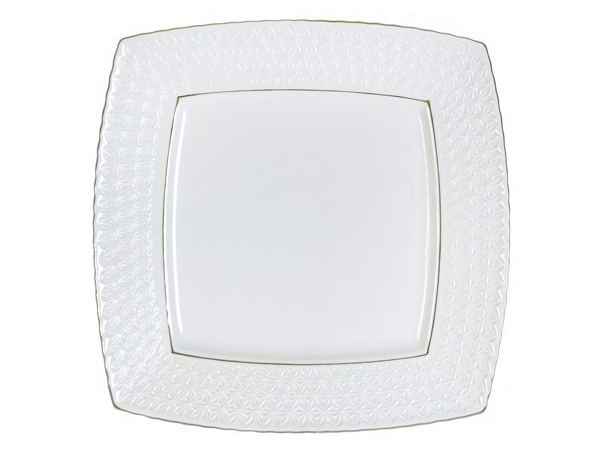 Представляем вам квадратную десертную тарелку размером 20 см из высококачественного фарфора. Эта тарелка станет идеальным дополнением к вашему столу, добавляя нотку изысканности и стиля. Благодаря рельефной текстуре по краю и золотистой окантовке, она не только функциональна, но и привлекает внимание, создавая атмосферу праздника и уюта.
