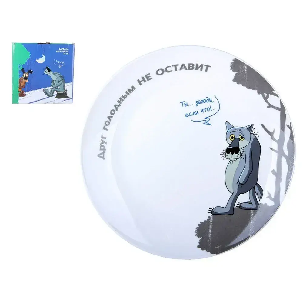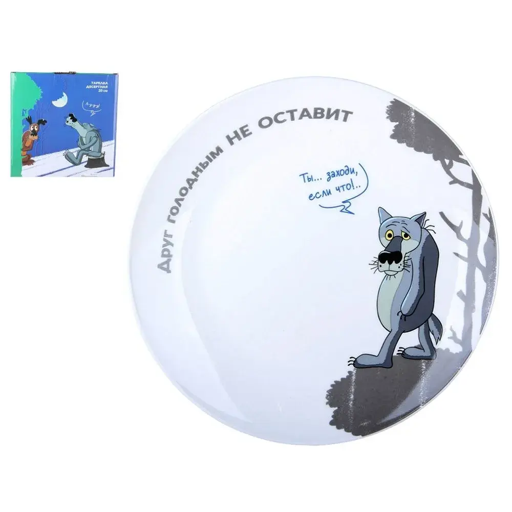 Эта круглая десертная тарелка диаметром 20 см создана для тех, кто ценит уют и оригинальные детали дома. Белоснежная гладкая поверхность из керамики украшена забавным изображением волка из любимого мультфильма «Жил-был пес», а надписи вдохновляют легкой иронией: «Не оставит друг голодным» и «Ты… заходи, если что!». Такой дизайн вызывает улыбку, дарит атмосферу тепла и отлично впишется в любое домашнее застолье.