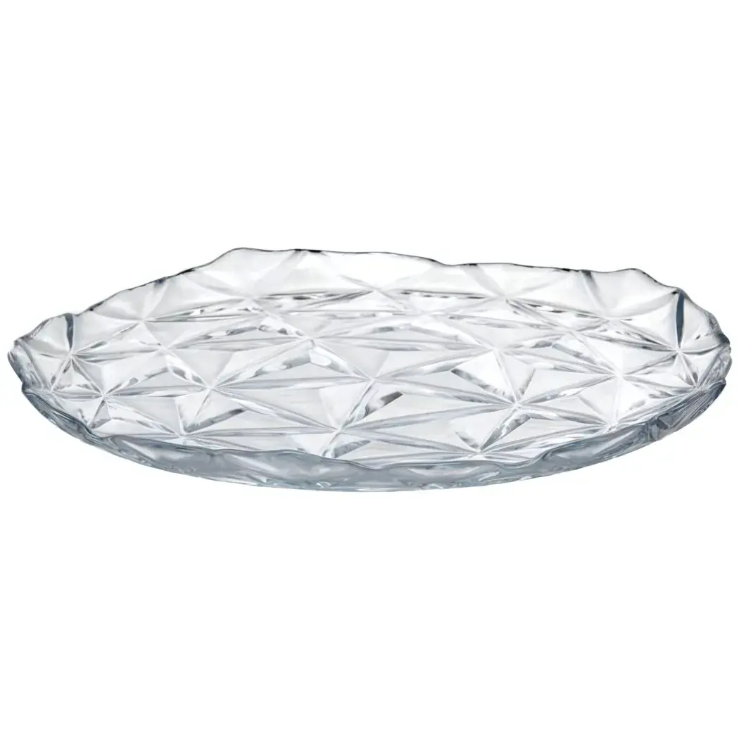 Прозрачное стекло с тонкой геометрической текстурой создает неповторимую игру света, подчеркивая красоту сервировки. Волнистый край добавляет изысканности и делает тарелку удобной для использования.