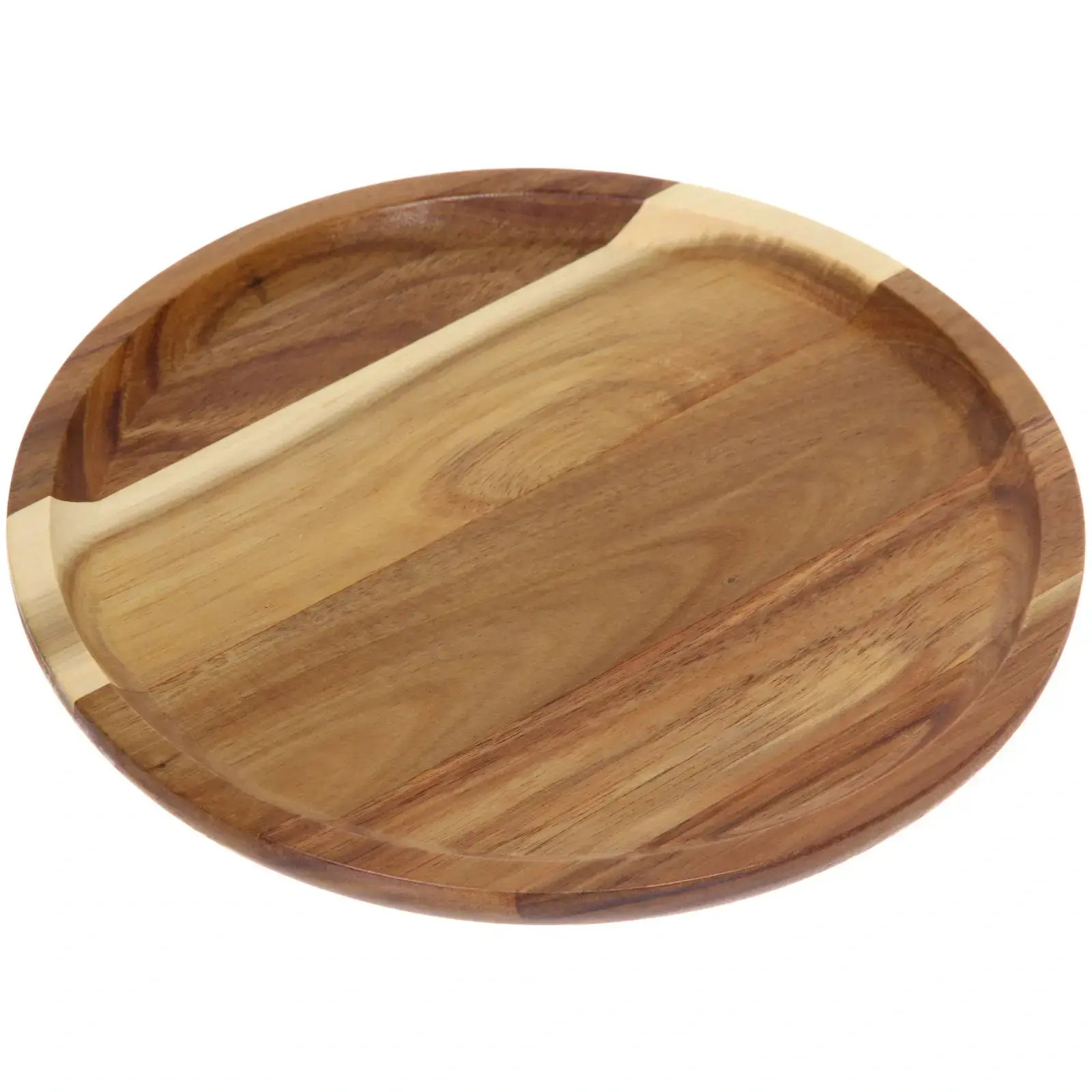 Размеры тарелки составляют 25 см в диаметре и 2 см в высоту. Она выполнена из различных видов древесины, что придаёт ей особый шарм. Тарелка имеет легкое углубление по периметру, что позволяет удерживать содержимое и предотвращает его высыпание. Это делает её идеальным выбором для сервировки как горячих, так и холодных блюд.