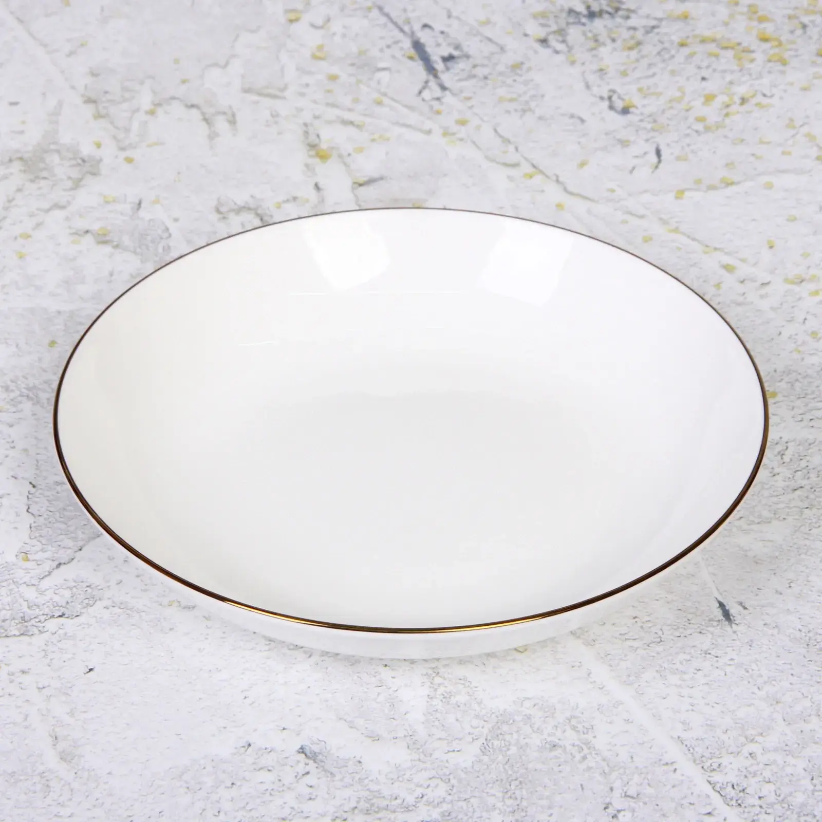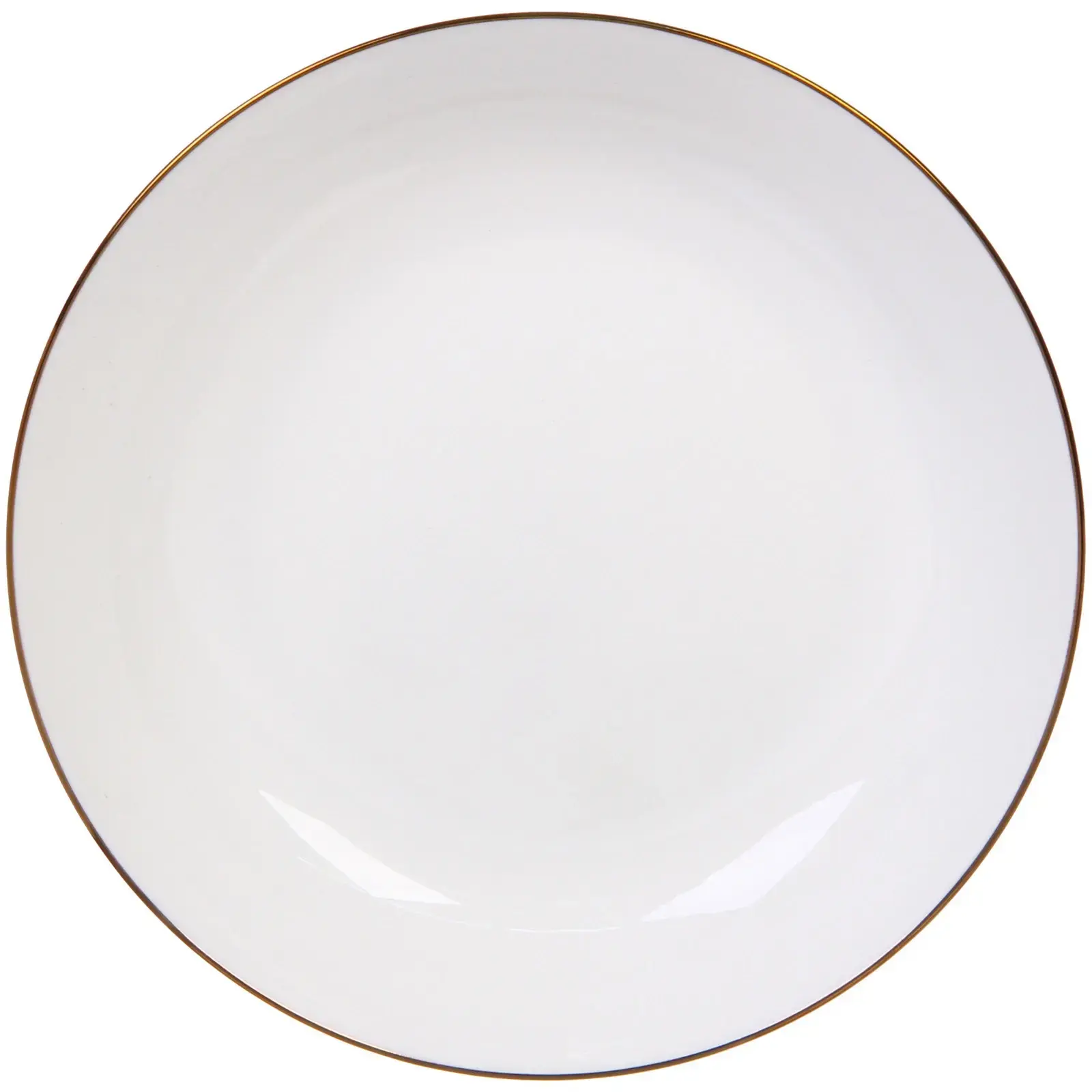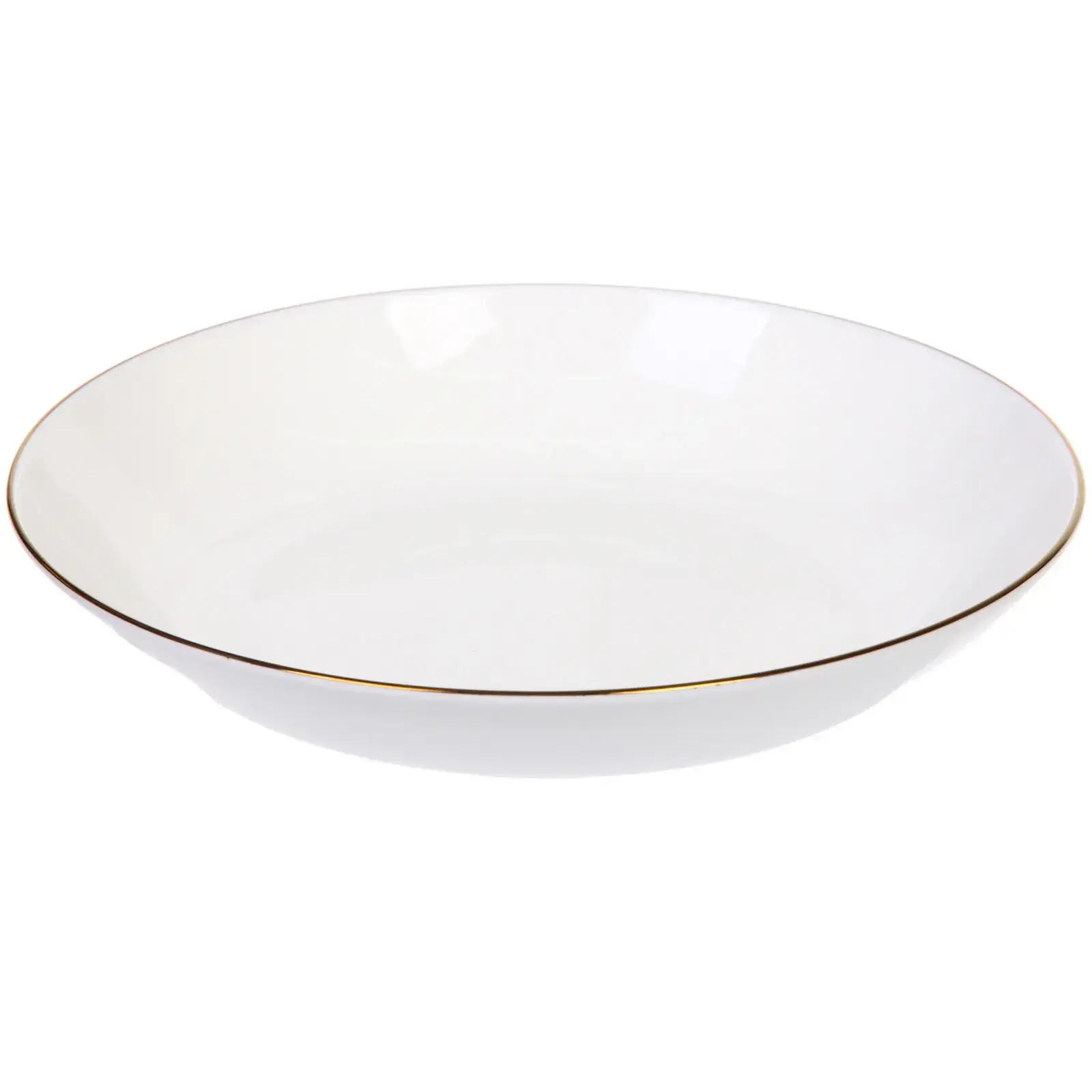 Глубокая фарфоровая тарелка с золотистым ободком сочетает в себе функциональность и эстетику. Её универсальный дизайн подчеркнет изысканность супов, паст и десертов, превращая обычный прием пищи в особенный ритуал.