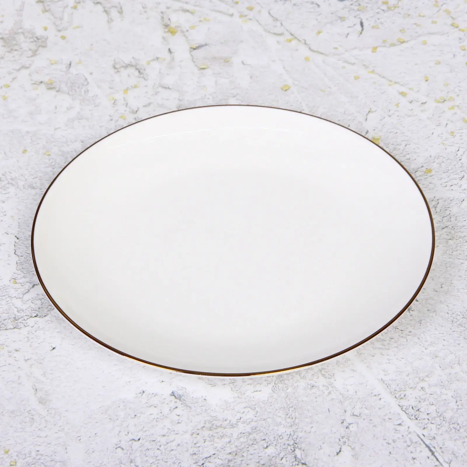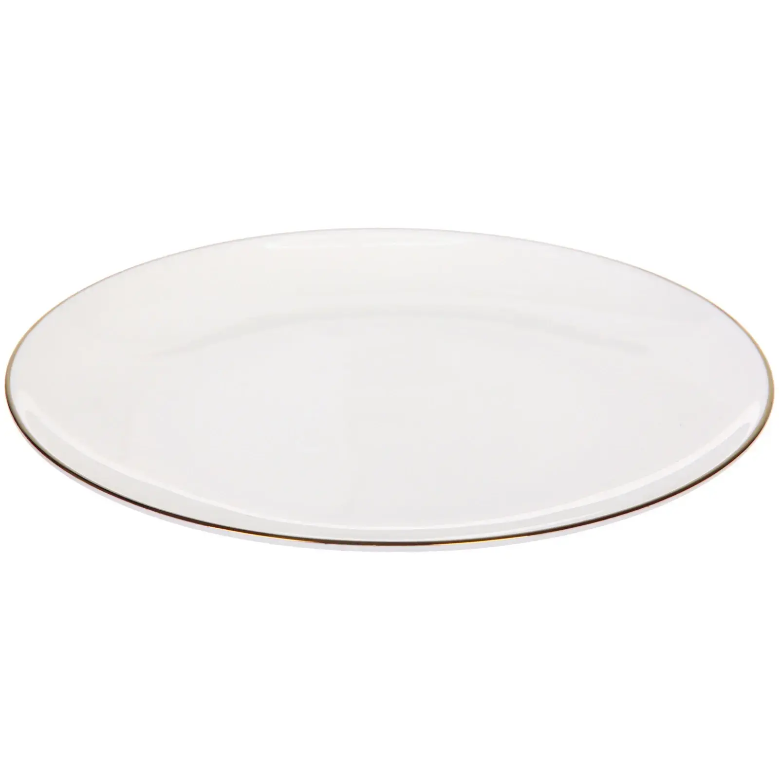 Плоская тарелка из коллекции 'White magic Gold' станет идеальным выбором для тех, кто ценит элегантную простоту и безупречное качество. Её нейтральный дизайн с тонкой золотистой окантовкой подчеркнёт достоинства любого блюда.