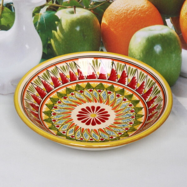Глубокая керамическая тарелка с авторской росписью — идеальное сочетание практичности и эстетики для вашей кухни. Яркий цветочный орнамент создаёт праздничное настроение, превращая обычный приём пищи в изысканный гастрономический опыт.
