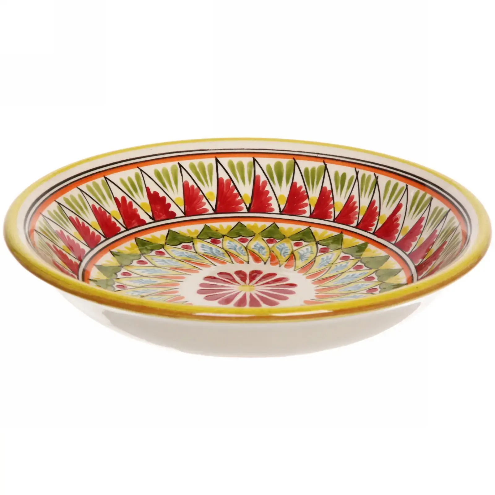 Традиционные цветочные мотивы и геометрические узоры созданы с использованием безопасных пищевых красителей. Сочетание желтого фона с многоцветными элементами добавит тепла в любую кухонную коллекцию. Тарелка полностью соответствует требованиям для контакта с пищевыми продуктами.