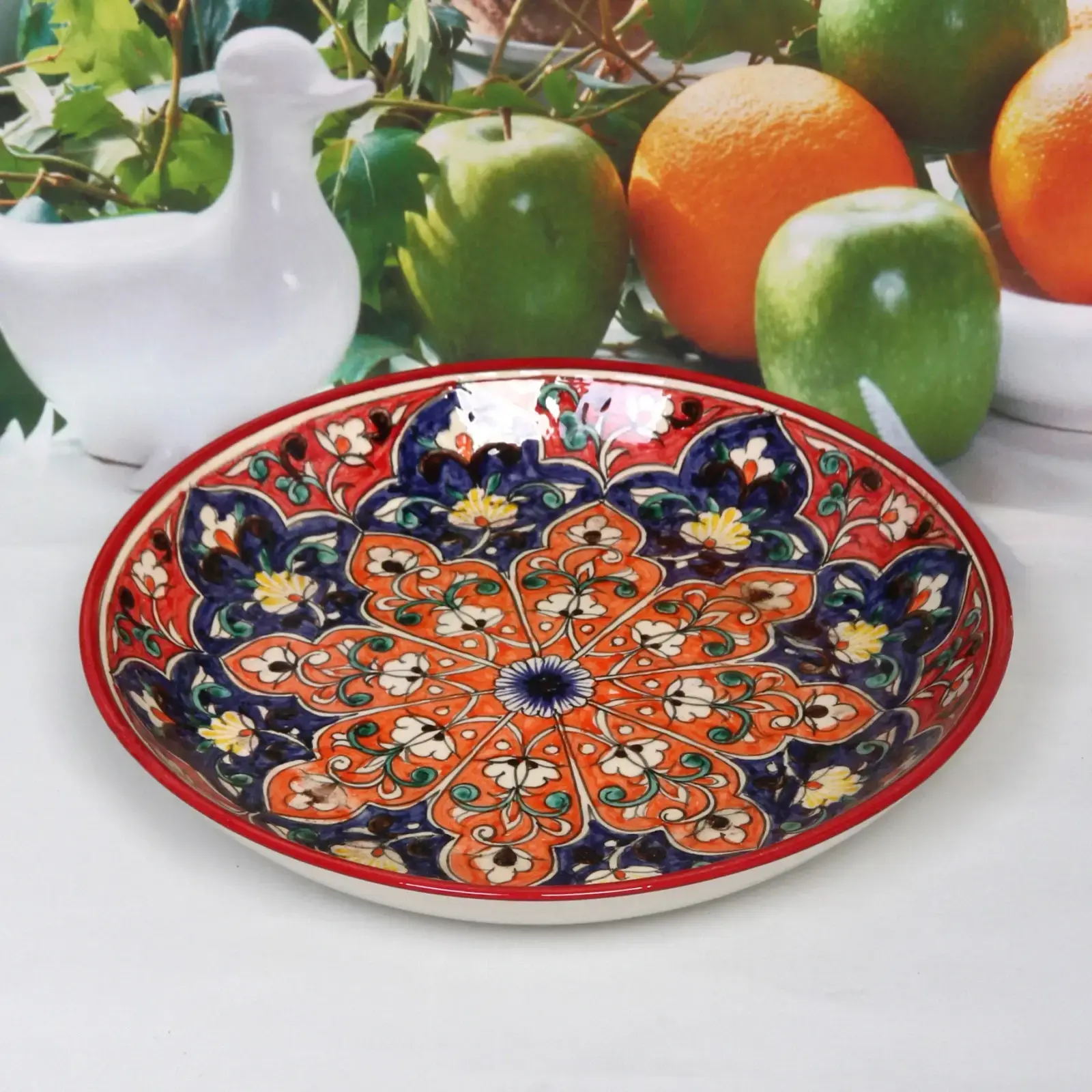 - Яркие цвета и восточный орнамент делают тарелку не только функциональной, но и декоративной.