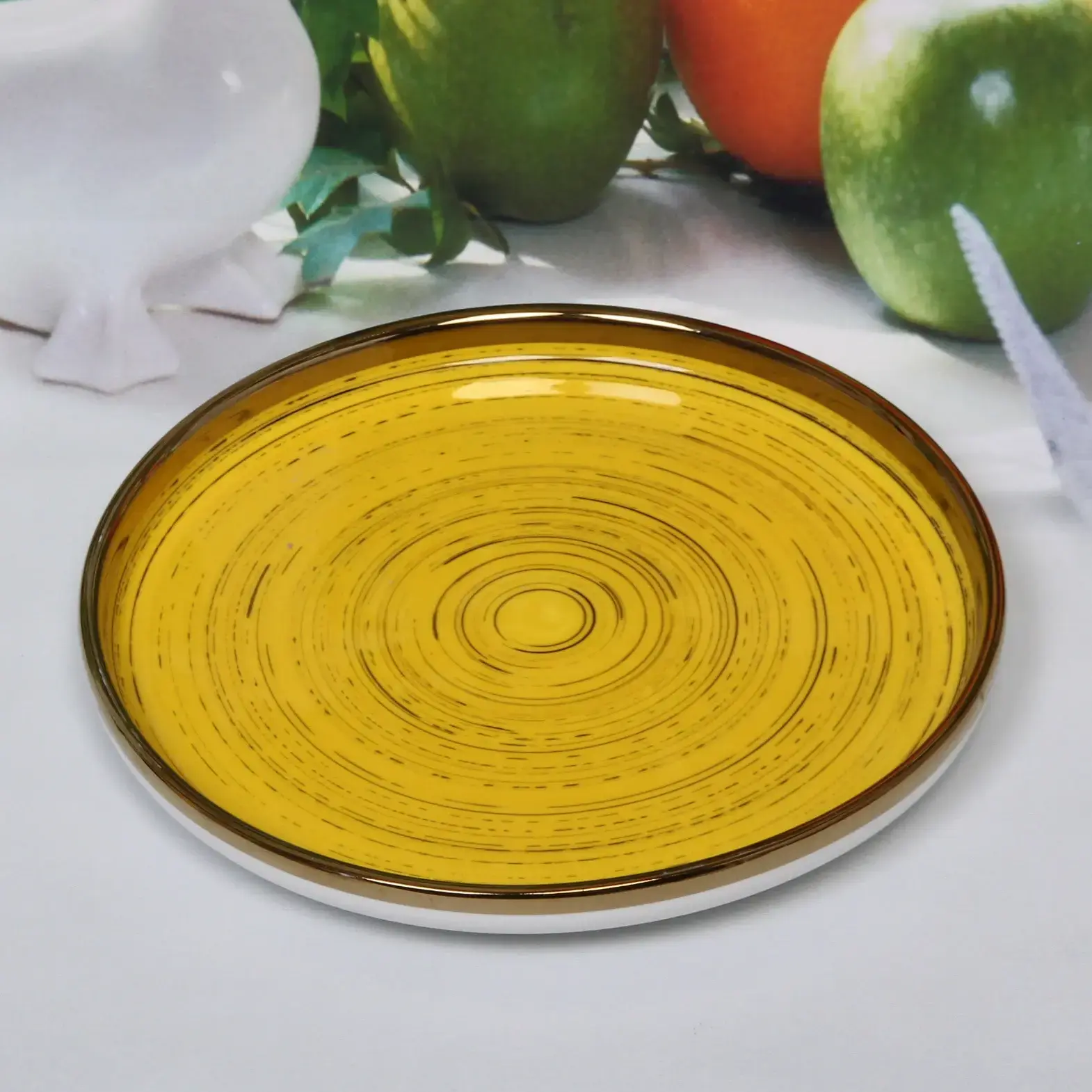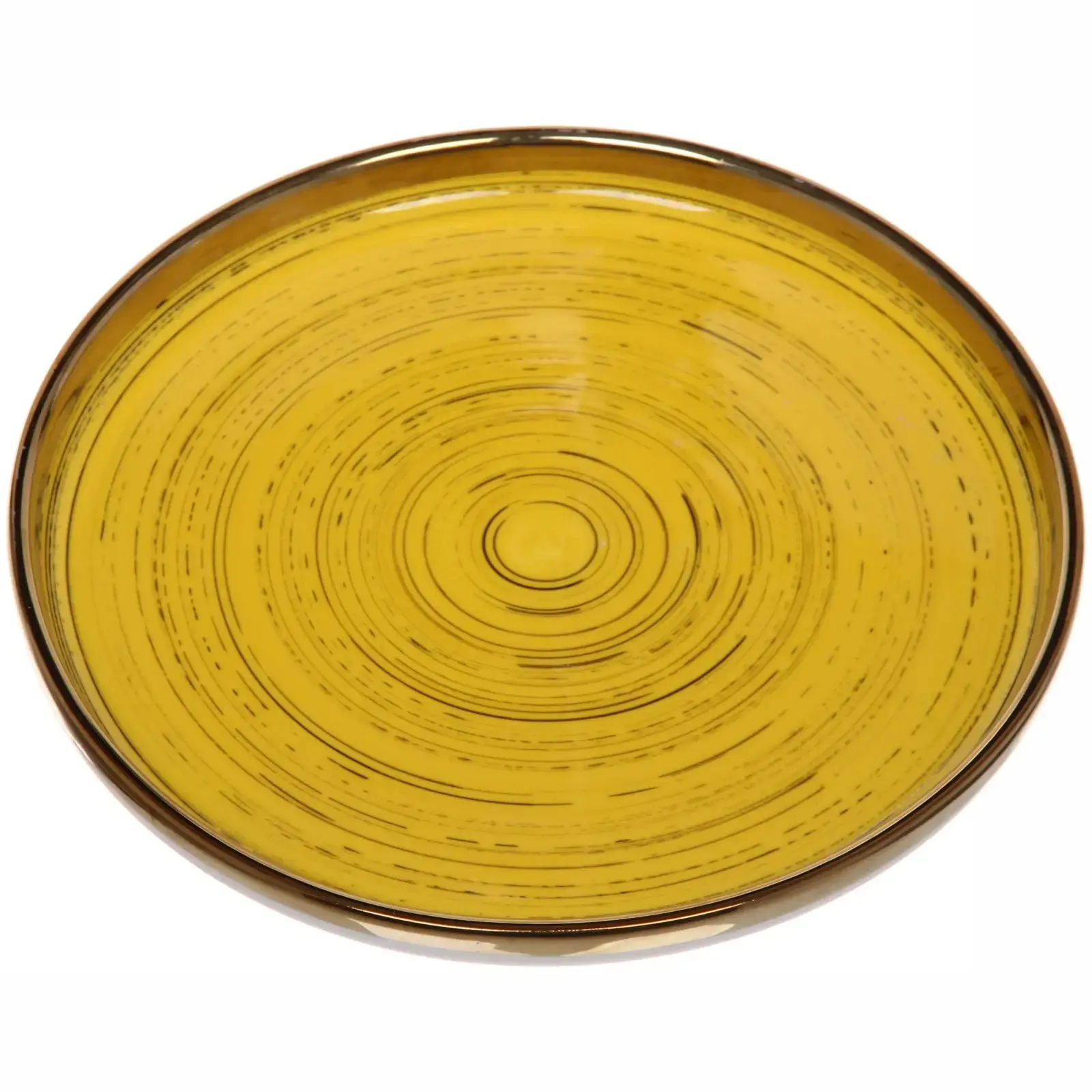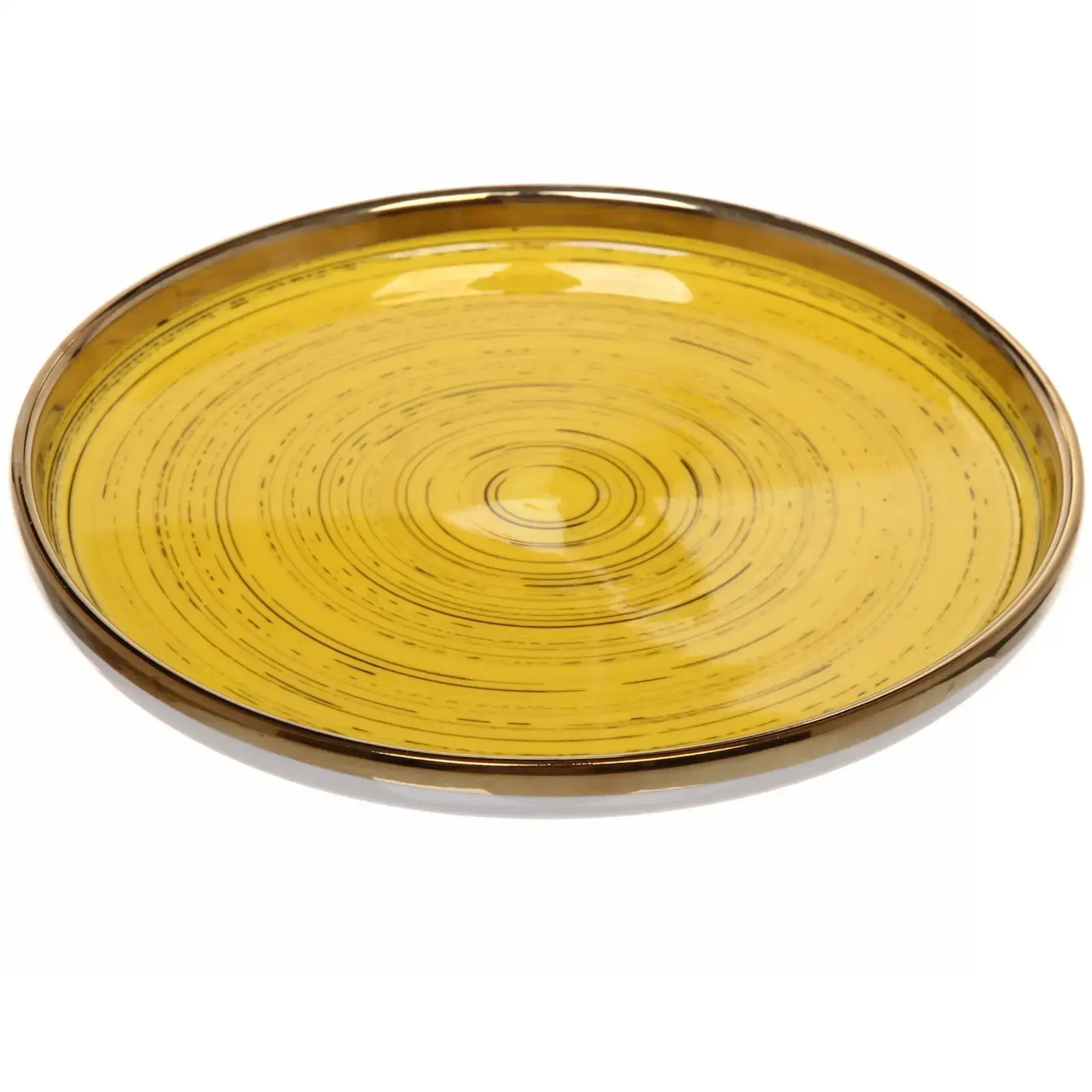 Керамическая тарелка «Dujon» сочетает изысканный дизайн с практичностью повседневного использования. Яркий желтый цвет с концентрическими узорами и золотистая окантовка создают элегантный акцент на любом столе.