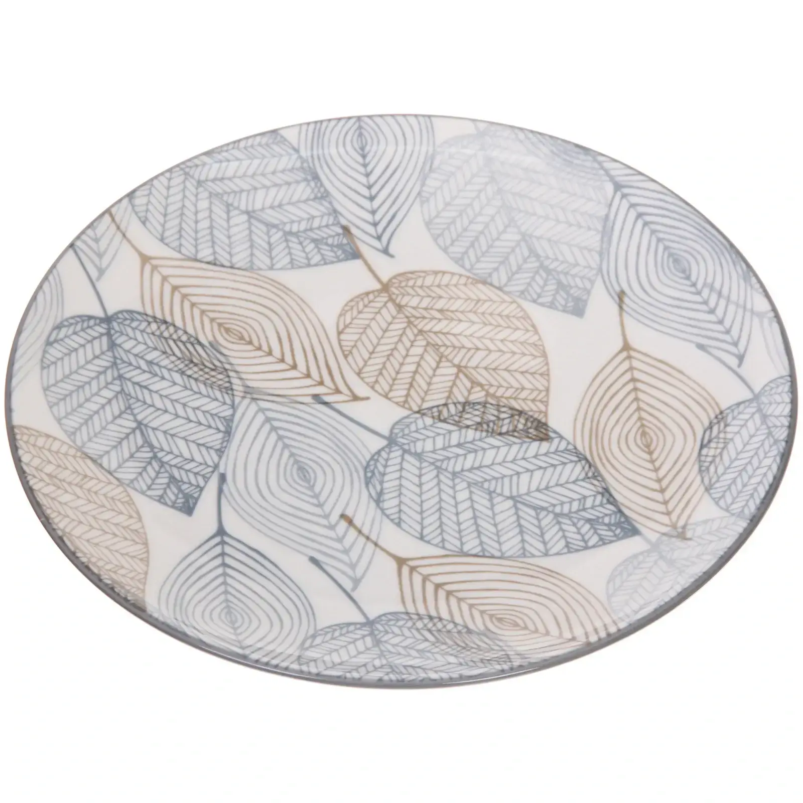 Размеры тарелки составляют 25 см в диаметре и 2,3 см в высоту. Кофейно-синий цвет с узором листьев делает её универсальной для любого интерьера. Тарелка подходит для использования в посудомоечной машине, что значительно упрощает процесс уборки после еды.