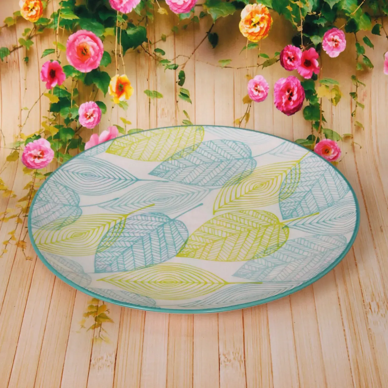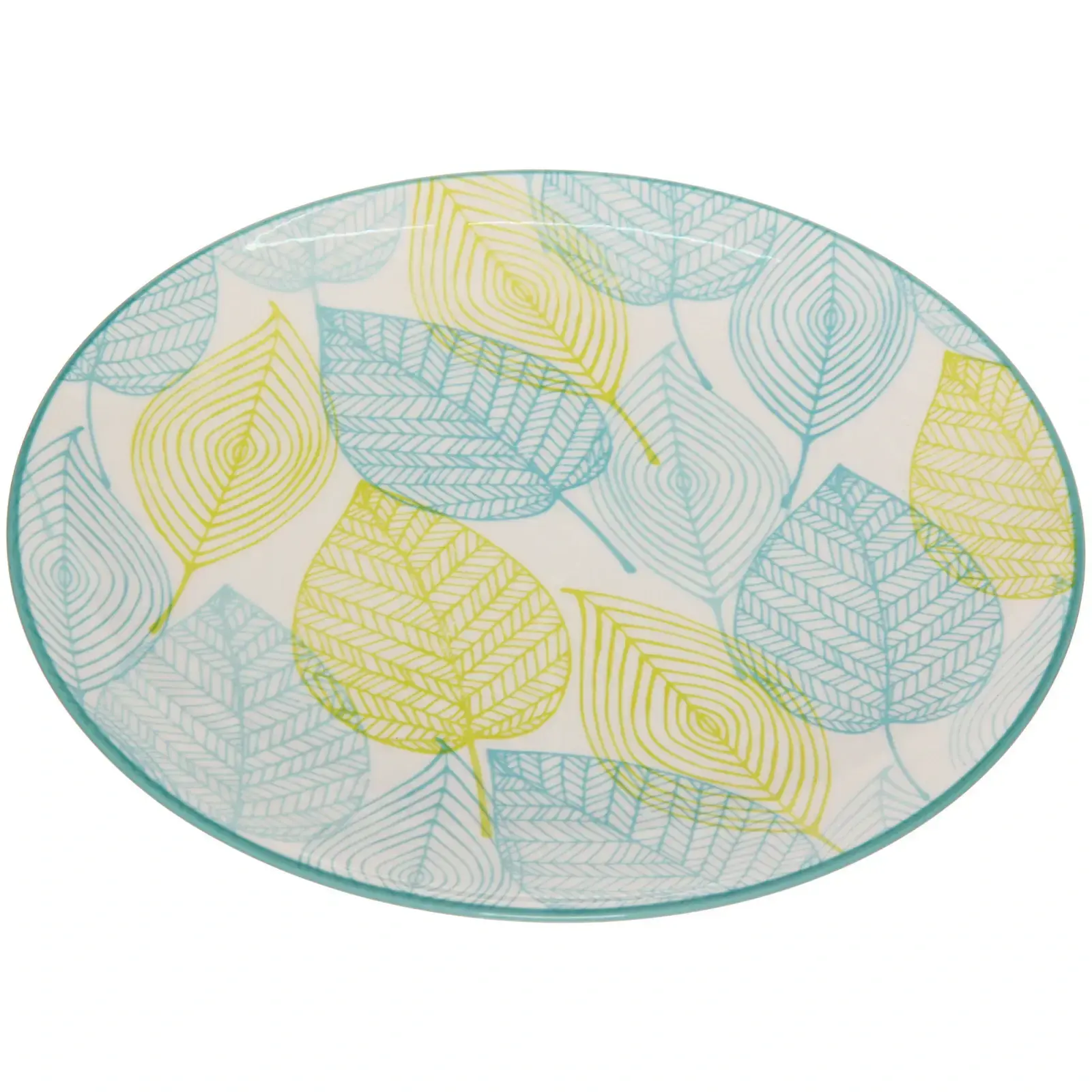 Размер тарелки составляет 25 см в диаметре и 2,3 см в высоту, что делает её удобной для сервировки. Керамика, из которой она изготовлена, обеспечивает прочность и долговечность, а также лёгкость в уходе. Тарелка имеет гладкую поверхность и слегка поднятые края, что предотвращает проливание пищи. Сочетание желто-голубых оттенков и узора с листьями придаёт ей уникальный и стильный вид.