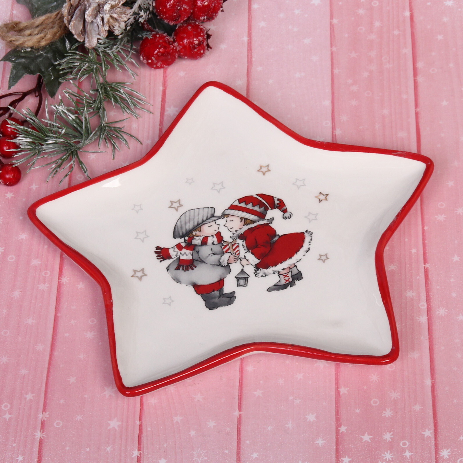 Тарелка имеет белый фон с красной окантовкой и изображение двух детей, что делает ее идеальной для новогодних праздников. Она не только функциональна, но и станет стильным элементом вашего интерьера. Не упустите возможность сделать ваш праздник незабываемым с этой красивой тарелкой!