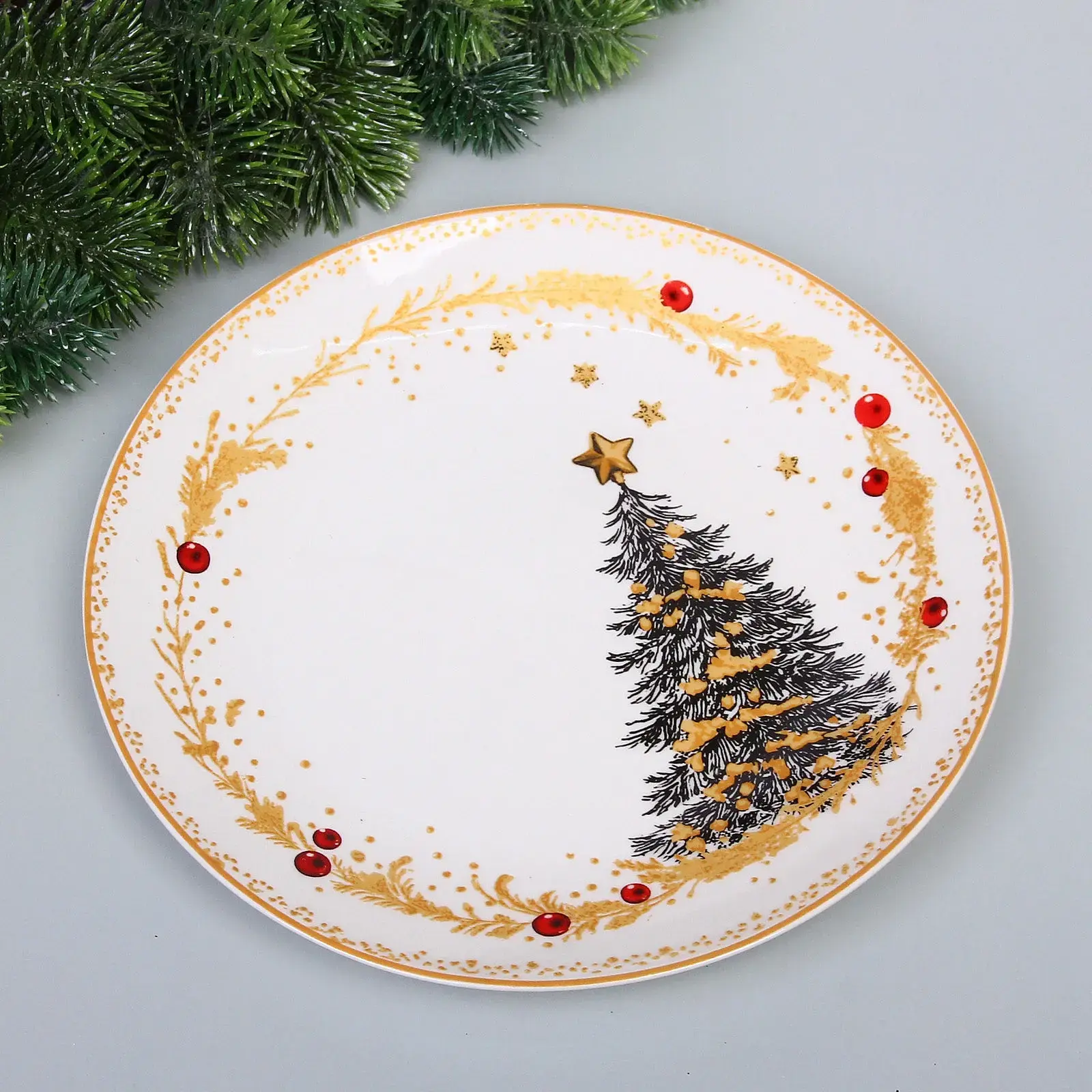 Керамическая тарелка 'Новогодний шик' станет идеальным дополнением вашего праздничного стола. Её элегантный дизайн с золотыми и красными элементами создаст особое настроение зимних праздников.