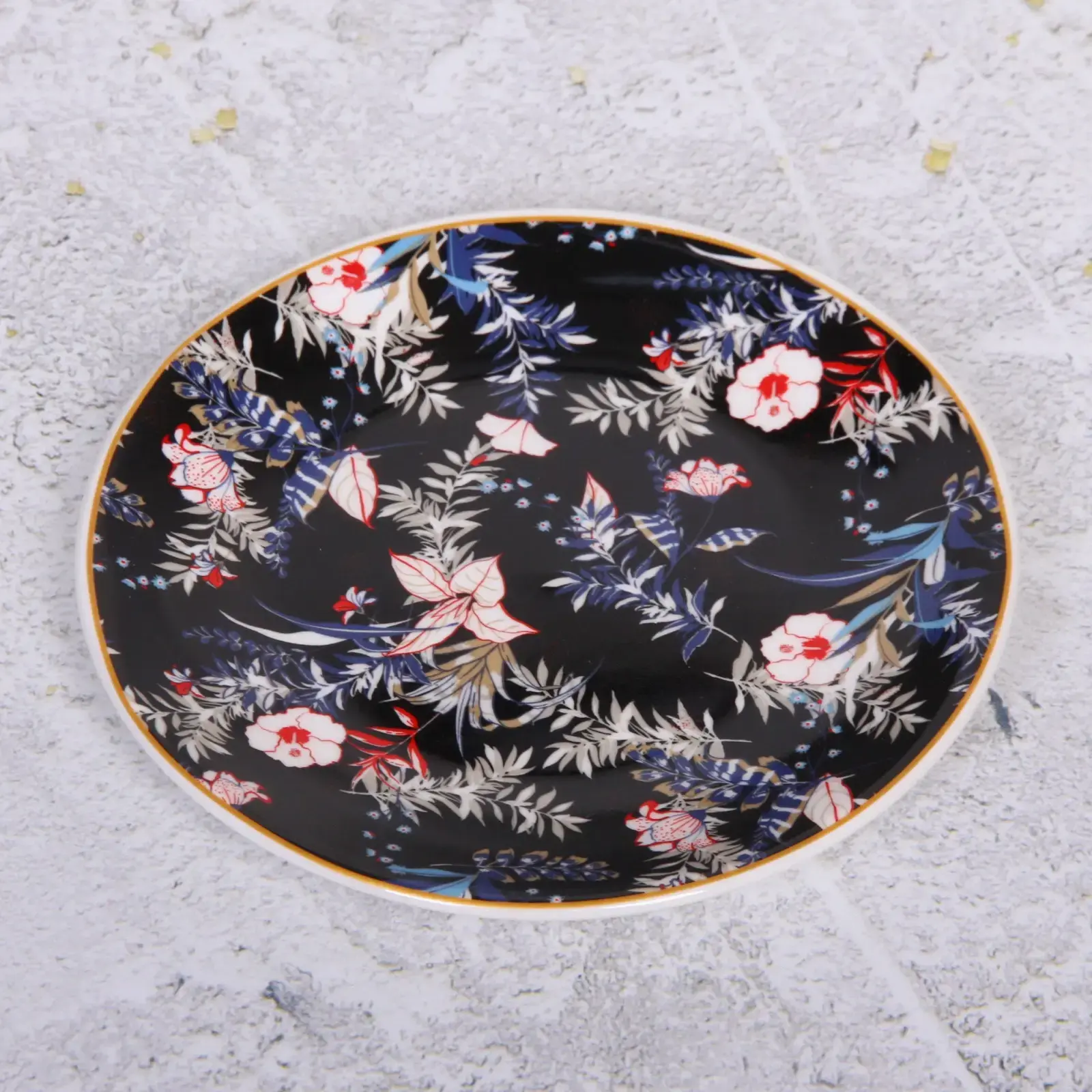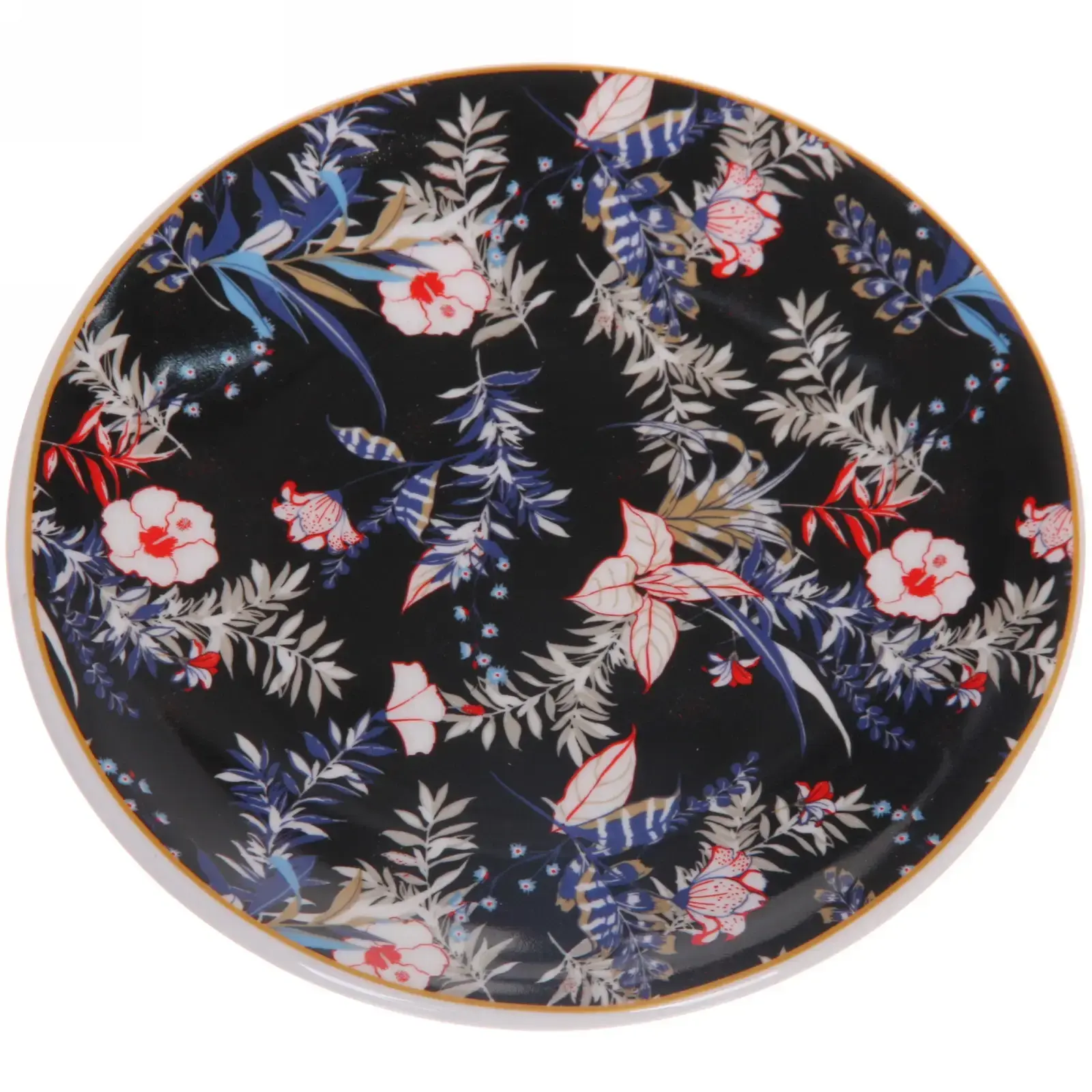 Черный фон с контрастными элементами красного, белого и синего цветов создает эффект глубины. Золотистая кайма добавляет ноту роскоши, гармонируя с любым типом посуды. Благодаря компактным размерам тарелка удобно размещается в посудомоечной машине и на полках хранения.
