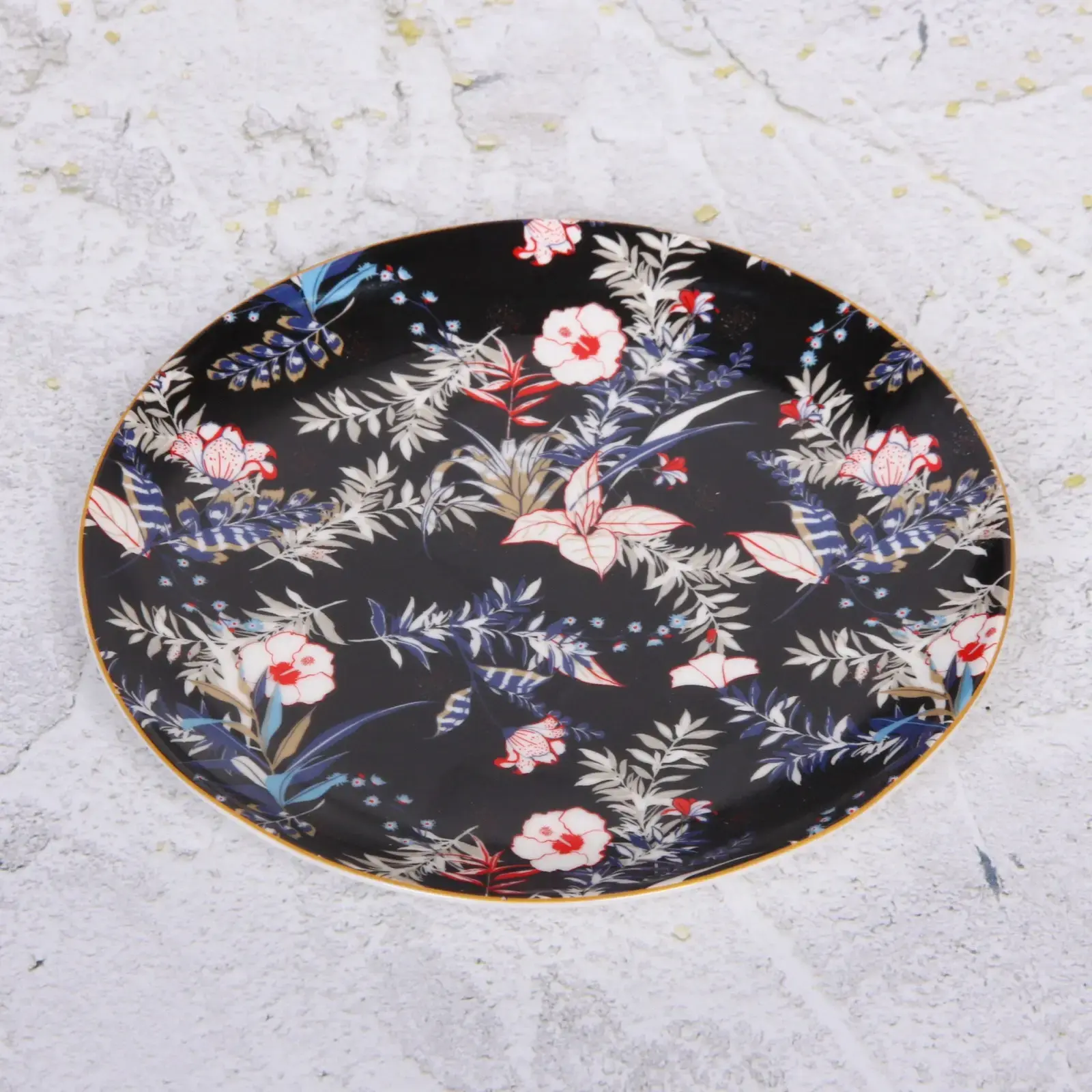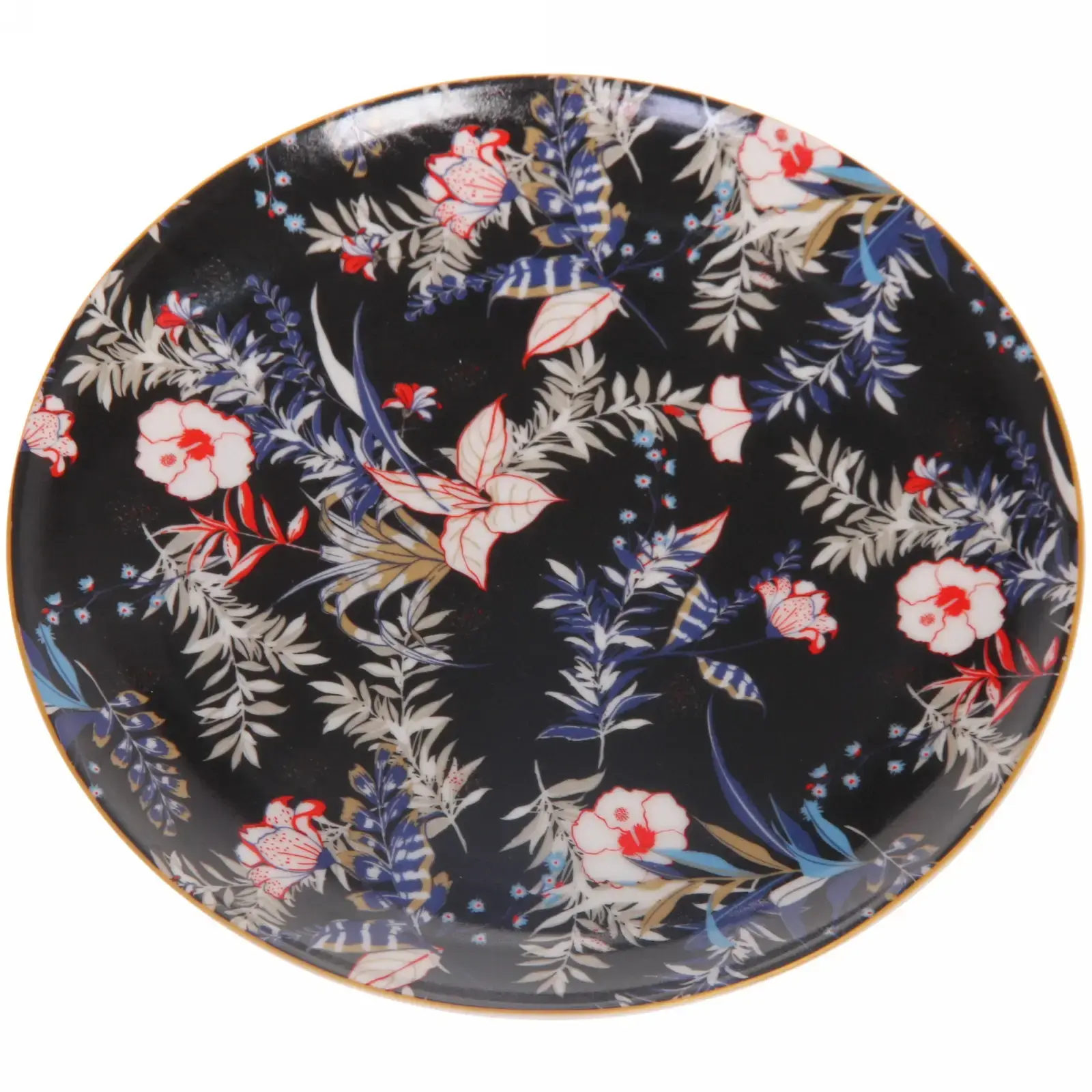 Декоративная тарелка «Paradise» сочетает в себе функциональность и художественную ценность. Изысканный цветочный узор на глубоком черном фоне с золотой окантовкой создает эффектный акцент в сервировке и интерьере.