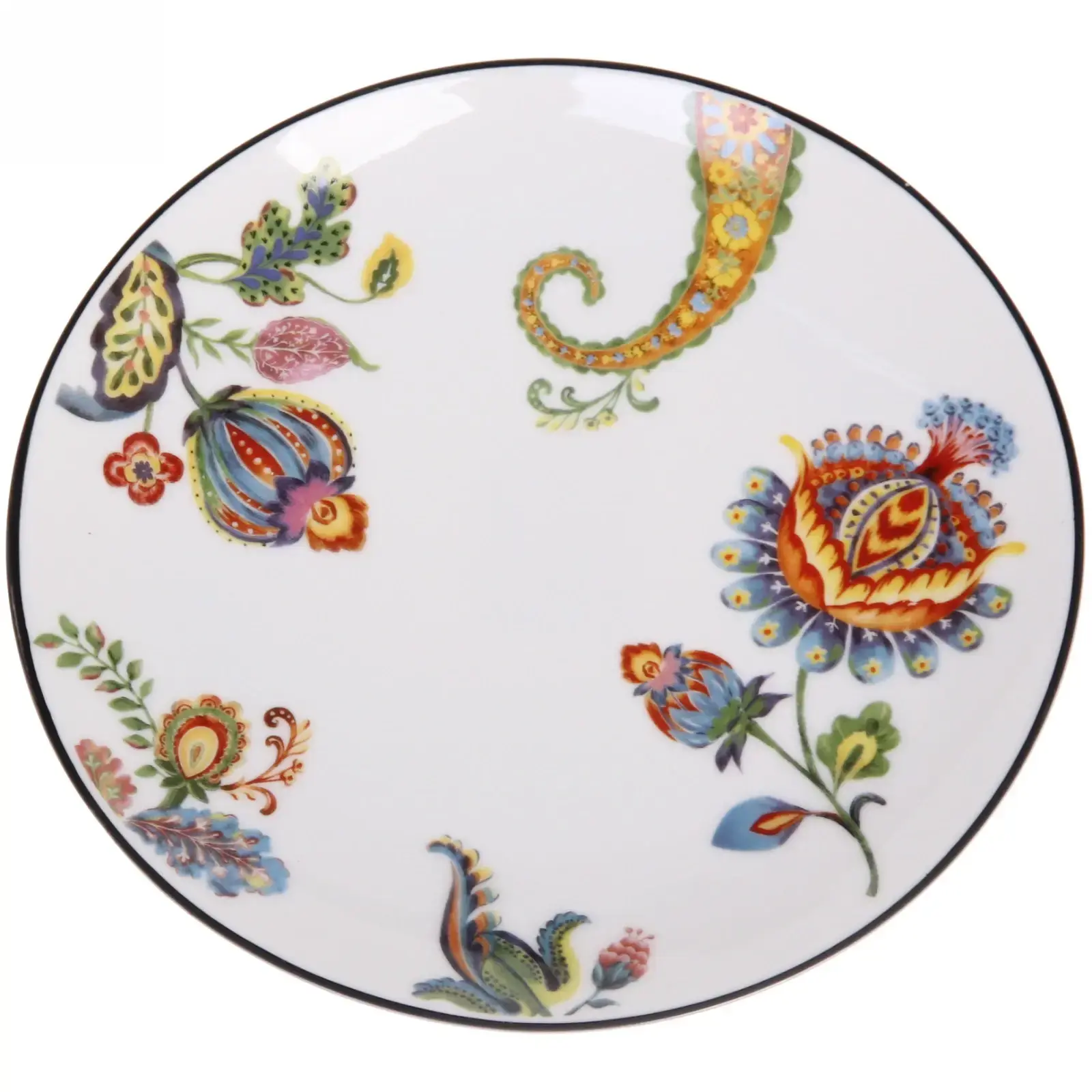Размер тарелки составляет 17,5 см в диаметре и 1,6 см в высоту. Она выполнена из качественной керамики, что гарантирует ее долговечность. Узоры на тарелке включают стилизованные цветы и листья, выполненные в красном, синем, зеленом и желтом цветах, что делает ее универсальной для любого интерьера.