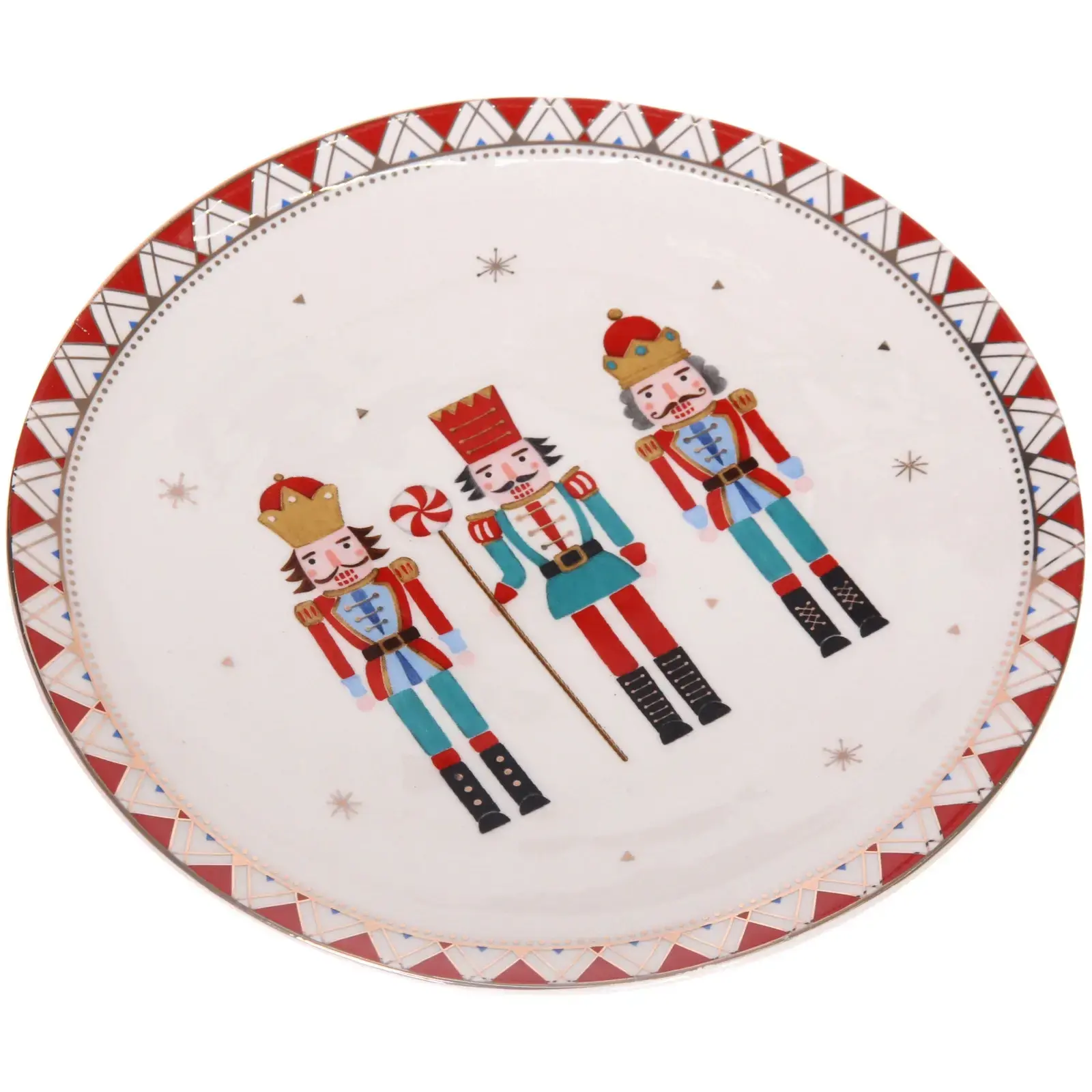 Тарелка имеет диаметр 21 см и толщину 1,2 см, что делает ее идеальной для подачи различных блюд. Она прекрасно подходит для новогодних застолий, а также может использоваться как декоративный элемент в интерьере. Благодаря своему яркому дизайну с изображением трех солдатиков, тарелка станет отличным акцентом на праздничном столе.