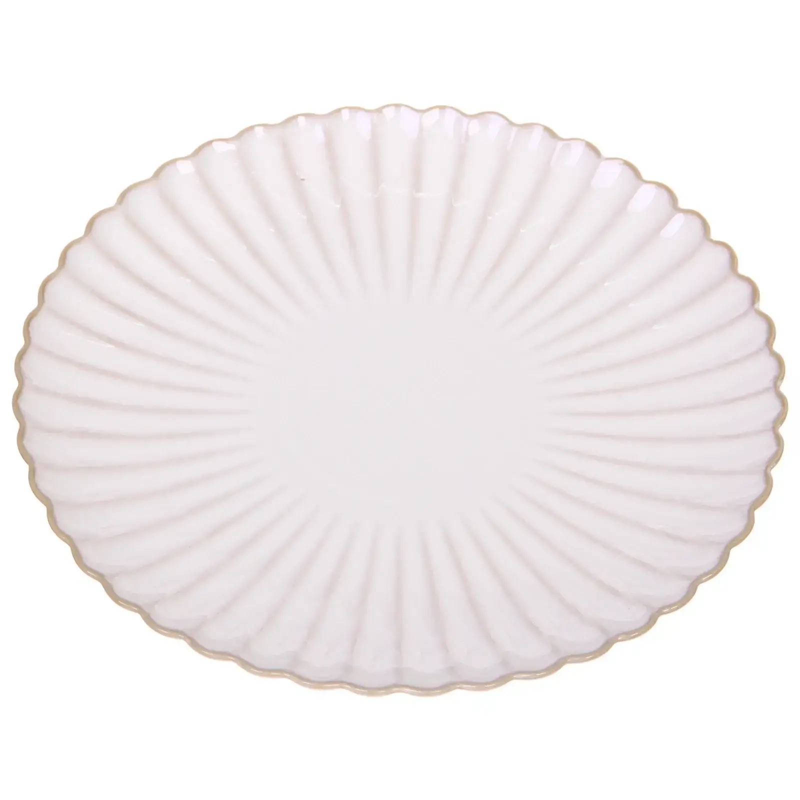 Изготовлена из прочной керамики, которая сохраняет тепло блюд. Овальная форма с рельефными бороздками создает эффект ручной работы, а золотистая окантовка подчеркивает изысканность сервировки. Совместима с посудомоечной машиной (режим деликатной мойки).